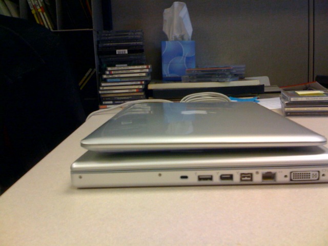 store yesterday to buy the airport extreme and the sales guy said they had a macbook air in the back and showed it to me!!! I feel in love, its amazing, the screen is amazing and so it how sturdy it feels. I know it's old news now, but here is my macbook pro and macbook airView attachment 100363