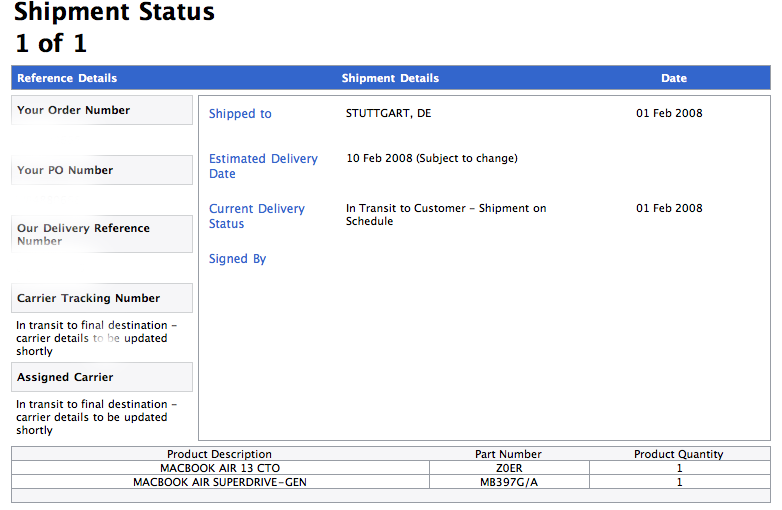 MBA (FR): 1.6/80; Order: Jan 17 - Not yet shipped - Feb 7/13