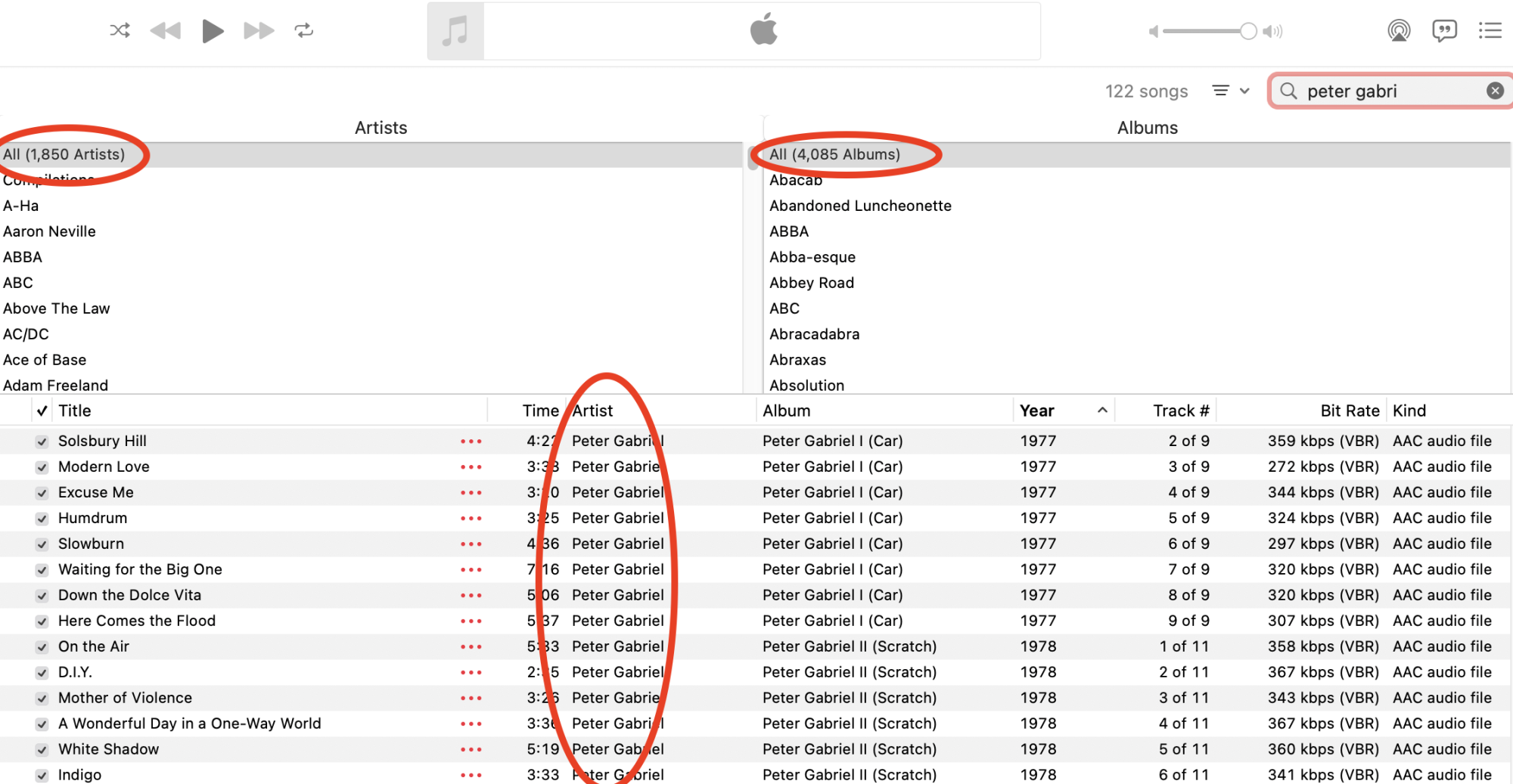 For example: I could search for "Peter Gabriel" and all results containing that combination of letters will show in the main window, but the album window no longer shows results whittled down to the fifteen albums I have ripped to my drive.