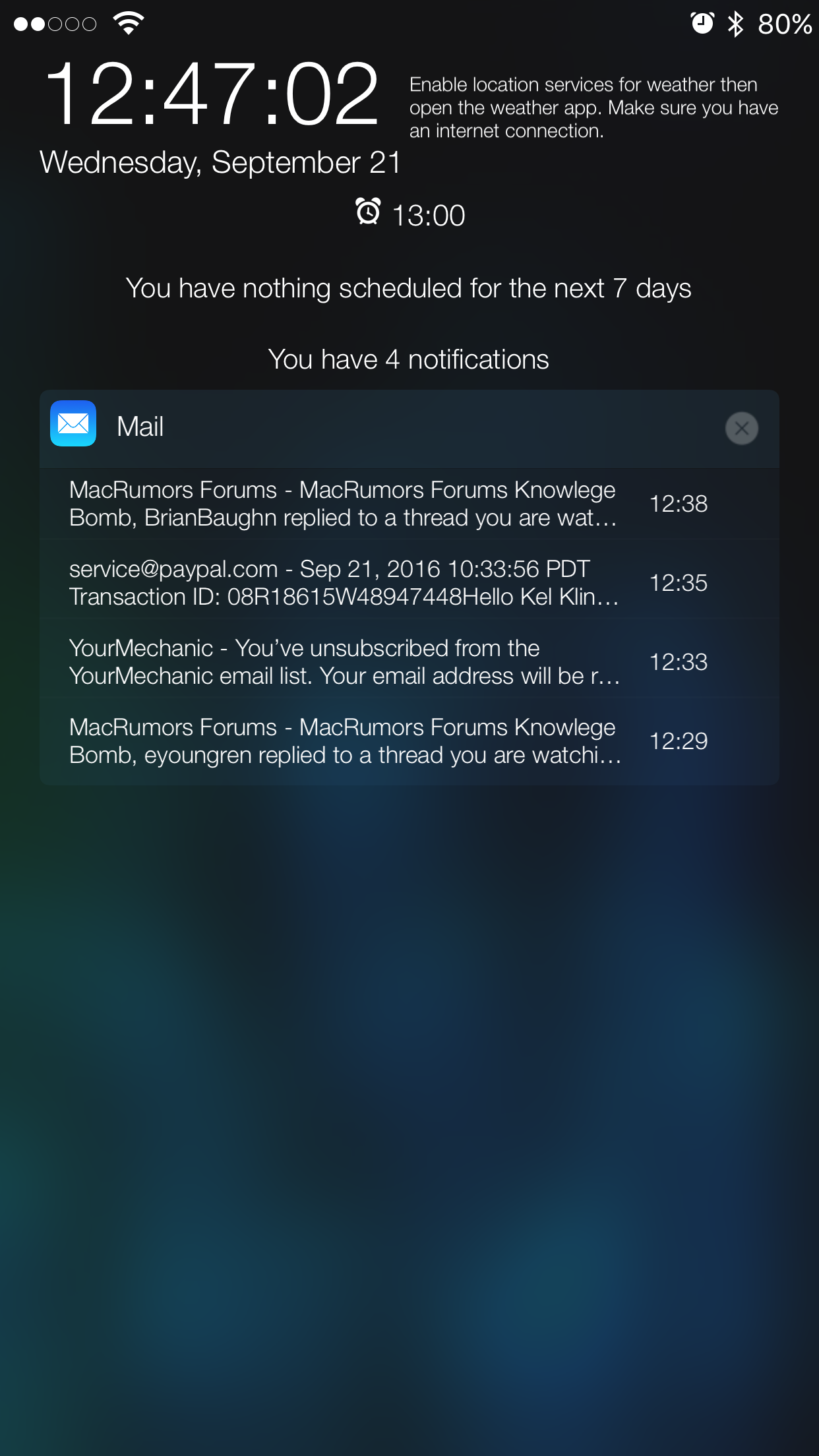 Yeah there's certainly some things I would change like the music controls being minimized and not showing progress scrubber, and as you mentioned the size of the time/date/weather stuff at the top. It's definitely the best I've come across and will be put to use since I dropped the $5 for it.I had completely missed the release of Personal Assistant as I wasn't using iOS 9 when it came out. It's a nicely done tweak and I hope my $4.99 goes toward further customization. A slightly bigger font would be to my taste. Also, disabling the Reminders section (and leaving Calendars) would be nice as it's the first thing that shows. "Feed the Cat", "Take a Pill" or whatever is kind of ridiculous being there on TOP...I'll get an alert when it's time.