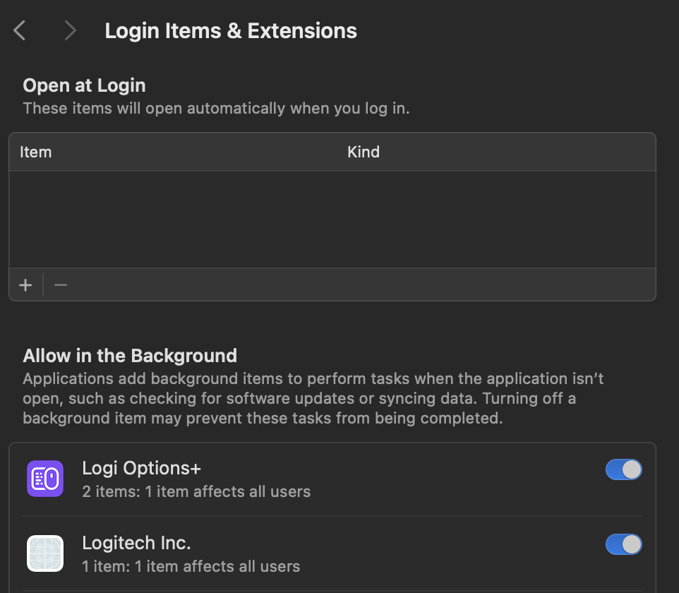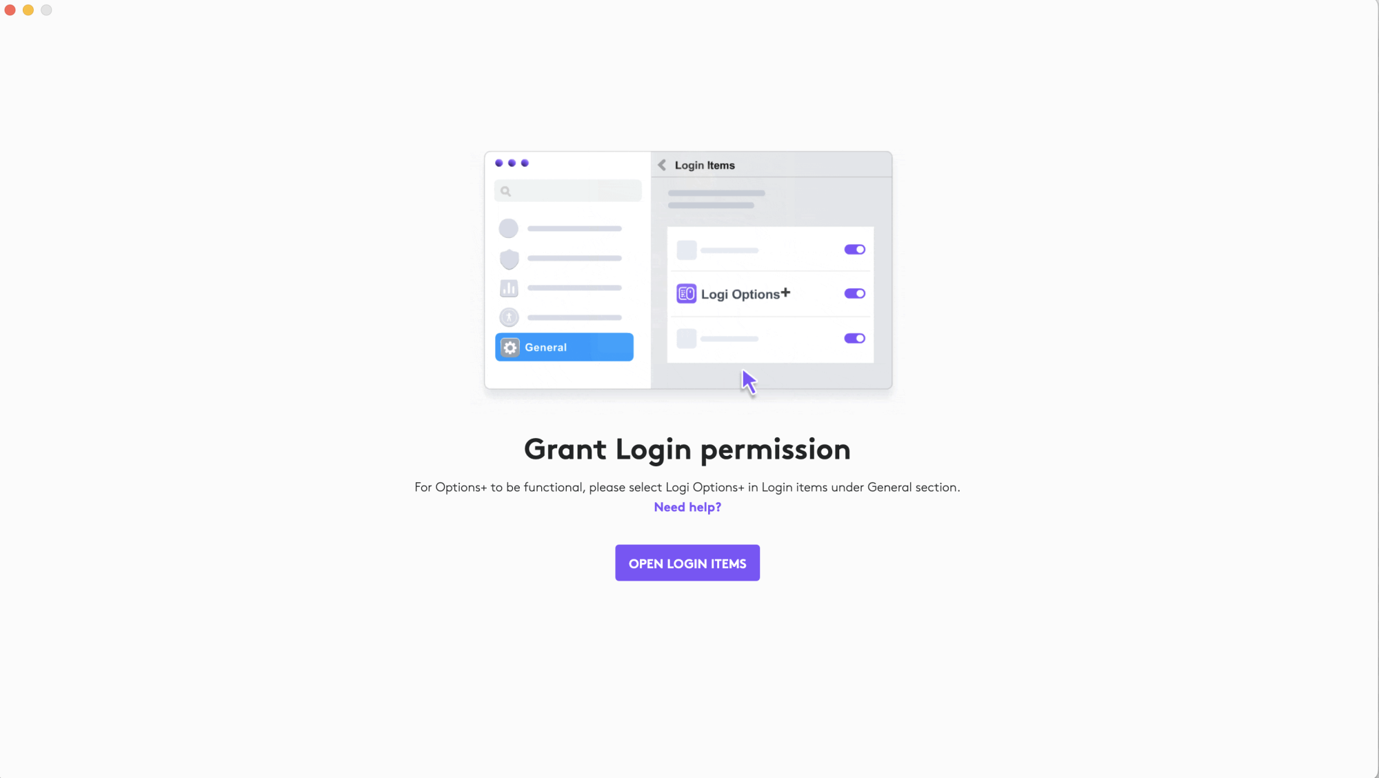 I've been experiencing this problem ever since v15.5 ( I think) Sequoia where the app upon launching would throw up a message asking to be granted permissions to open on login, but the animation that walks you through the process is for an older version of the General preferences window even though under the new version, it does show that Logi Options+ is authorized to run at login.