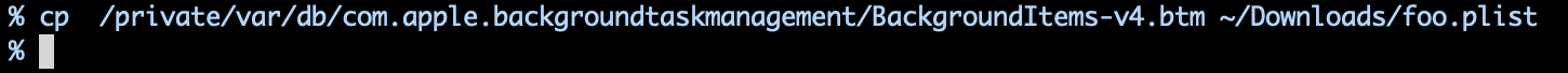 Code:% sw_vers ProductName: macOS ProductVersion: 13.0 BuildVersion: 22A380 % defaults read com.apple.loginitems | more { SessionItems = { Controller = CustomListItems; CustomListItems = ( { Alias = {length = 216, bytes = 0x00000000 00d80003 00010000 ce8cae5f ... 00012f00 ffff0000 }; CustomItemProperties = { "com.apple.LSSharedFileList.ItemIsHidden" = 1; "com.apple.loginitem.HideOnLaunch" = 1; }; Flags = 1; Name = "iTunesHelper.app"; },