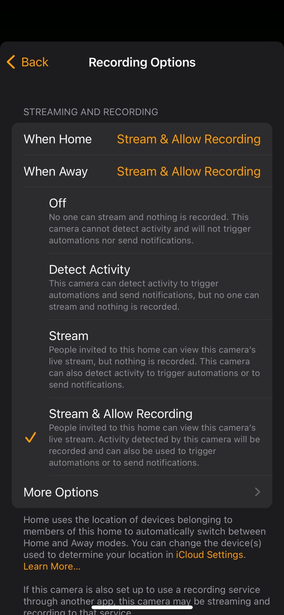 5 - Confirmed the Circle View settings in home, specifically Recording Options to ensure that When Home and When Away are set to "Stream & Allow Recording".