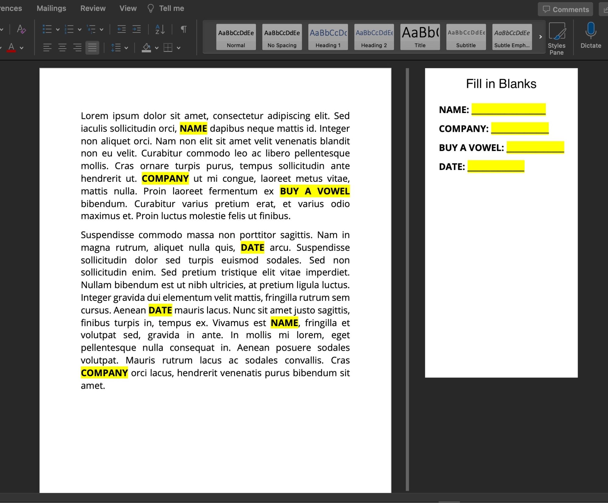 I do know that Word has some auto populate features and other form functions, but I’m specifically looking for something where there’s a separate tab that lists everything that needs to be filled in the document.