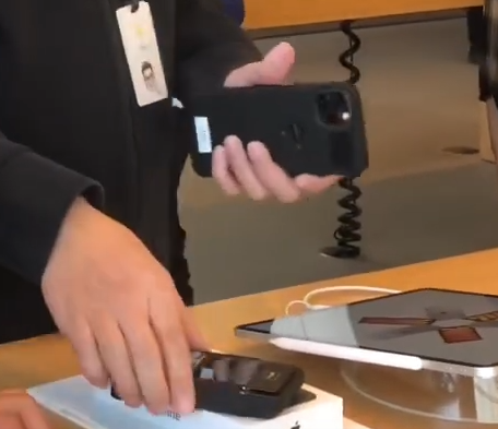 I was wonder that phone case apple employees using at apple store. Here an image from a video that i found in case that i help you.