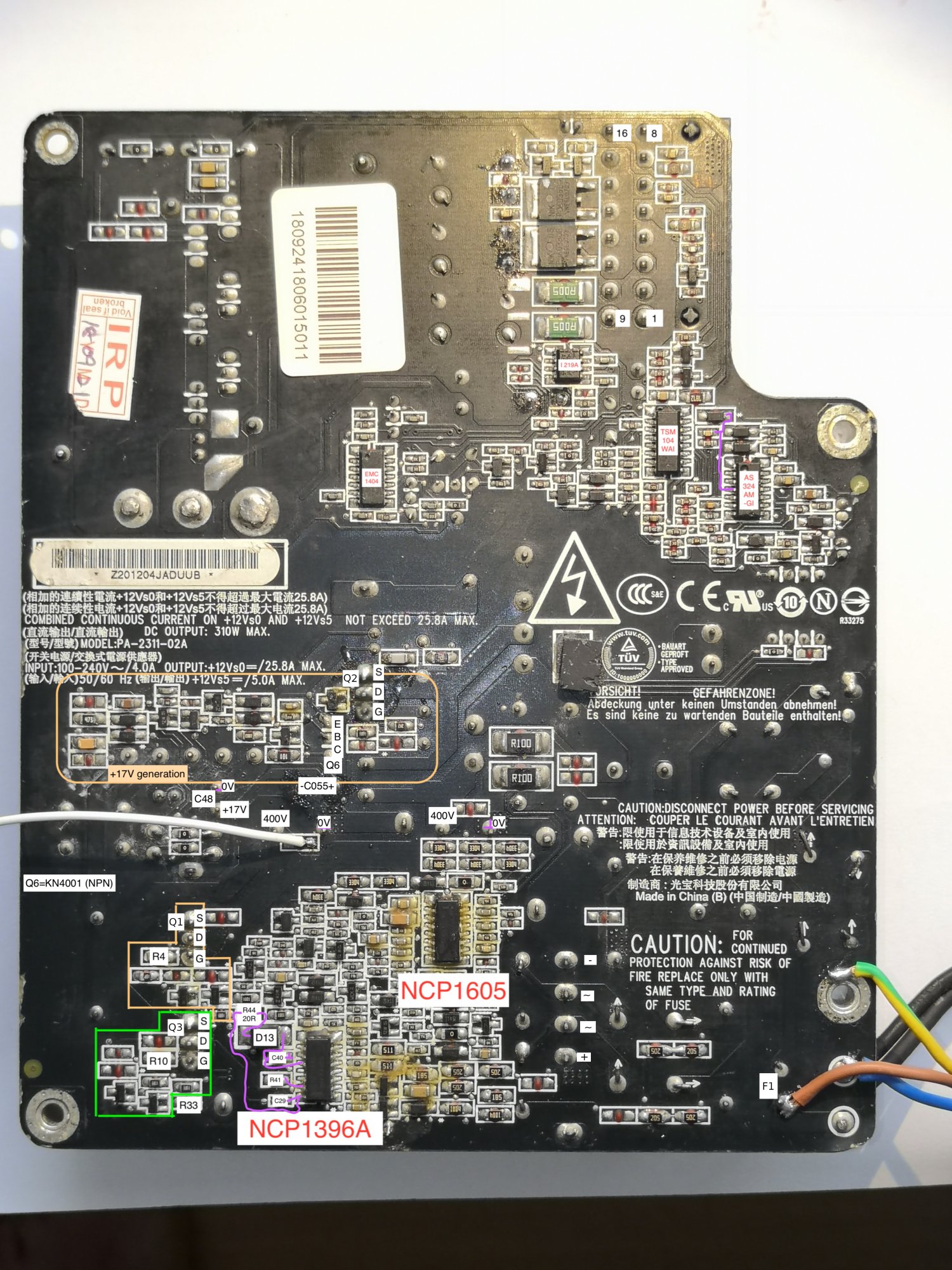Here are the notes that I took for myself, with designations of some critical parts. The designation of the parts follow the schematic above. T1 and T3 are Q1 and Q3 (naming mixed up, but it refers to the same part).