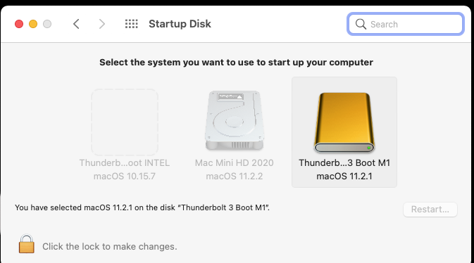 2. When I thought it had 'hung' I shut down the machine with the power button. I suspect this is why I couldn't boot from the internal afterwards even though the install was being done to the external. Not beyond the bounds that it would have an adverse effect on the internal.