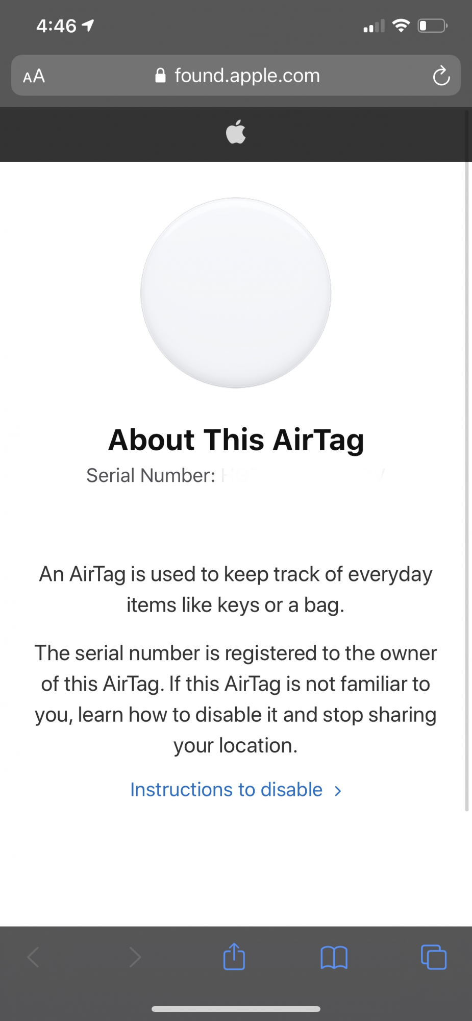 Side Note .... Android users can also get the Lost Info from your AirTag. I tried it with my Fold 2, but I had to place the the white side at the middle of the phone. I guess it depends exactly where the NFC is.