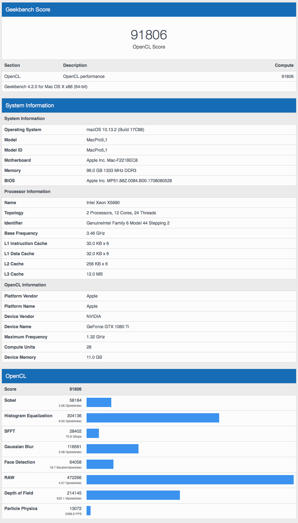 I don't worry too much about benchmarks but they can be a good diagnostics tool. My other Geekbench scores in macOS High Sierra, CPU, CUDA & Metal seem to be around the same as others with near identical systems. My OpenCL score seems to be quite low compared to others. Not like a little bit but a lot, like 50% lower or more.