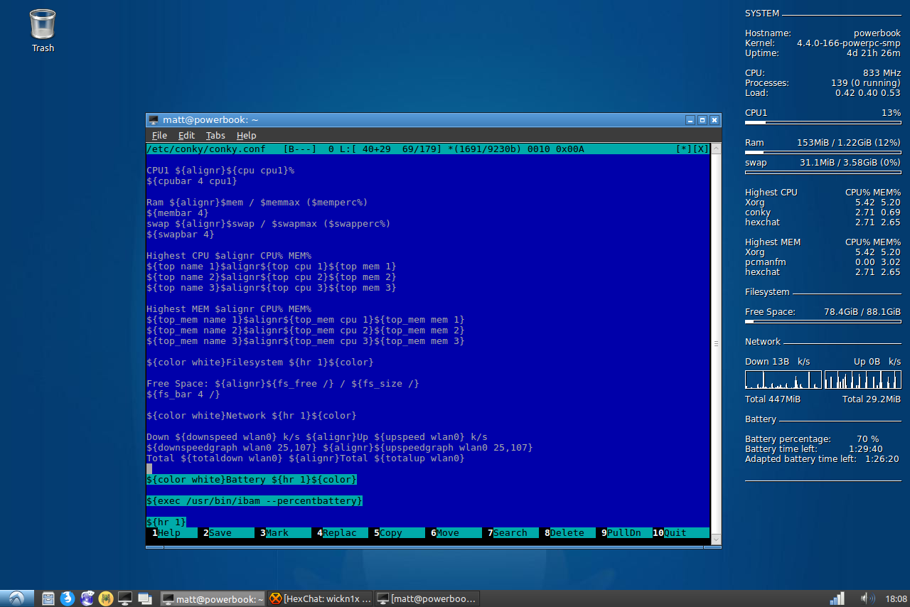 Then sudo mcedit /etc/conky/conky.conf and add the highlighted lines in the photo (esc+2 to save then esc+0 to exit)