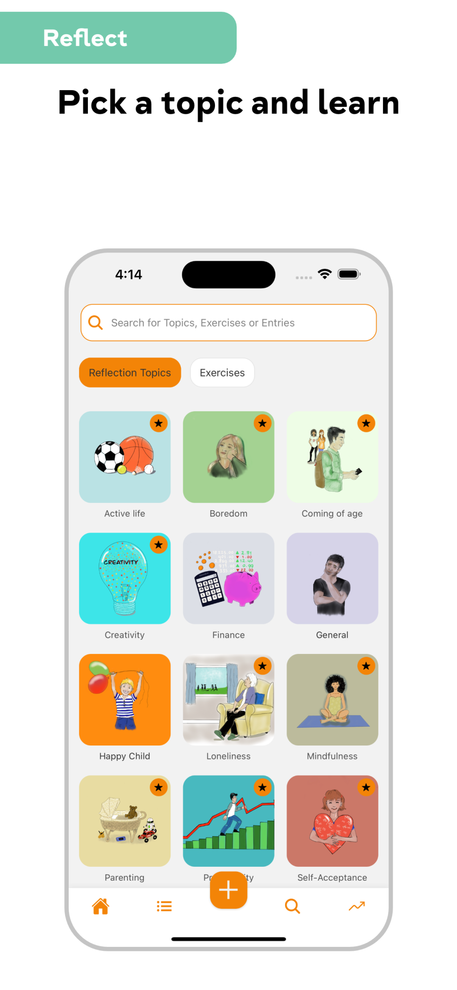 Reflecting occurs by answering (hopefully insightful) questions on a topic of choice. Including topics such as Stress, Self-Acceptance, Mindfulness and more are added regularly. By really thinking about the answers I hope the app can help gain insights to make the necessary life improvements.