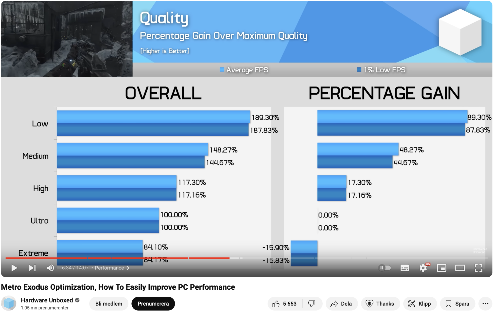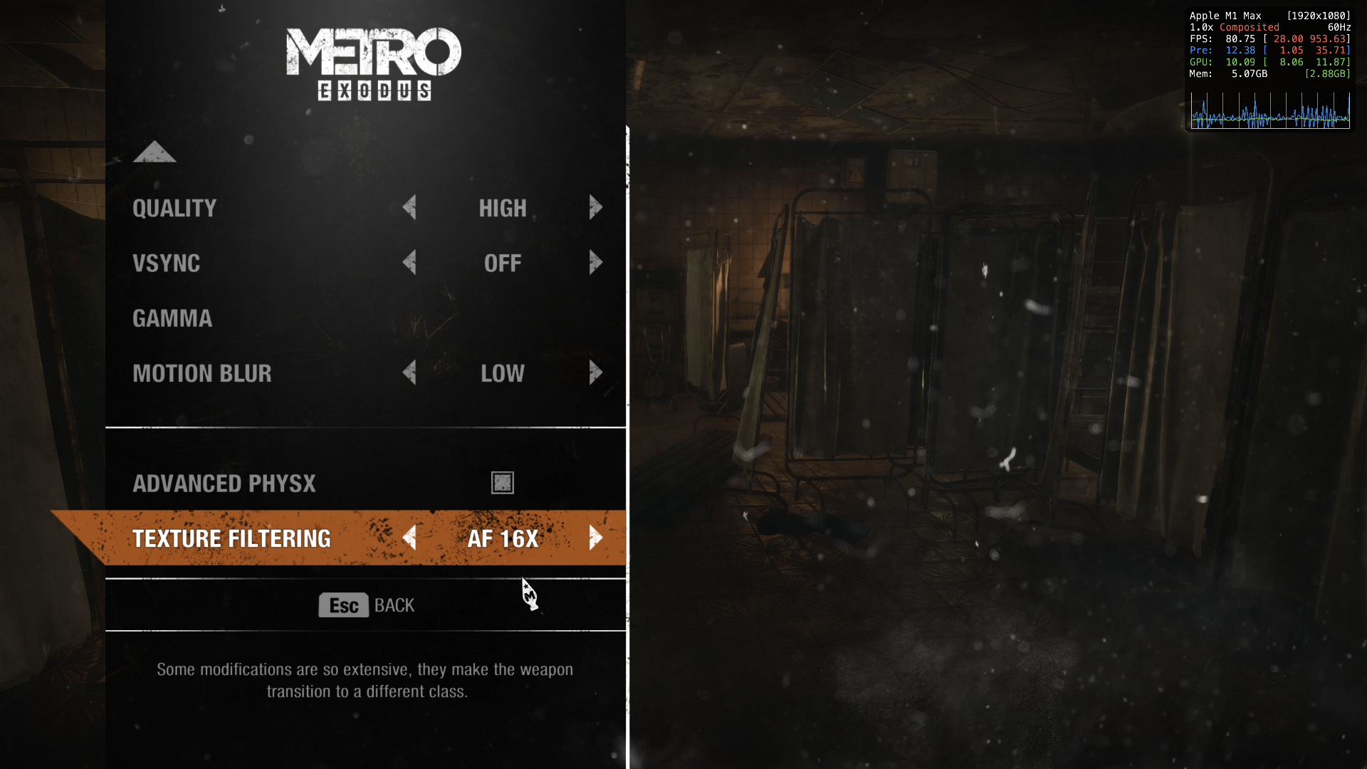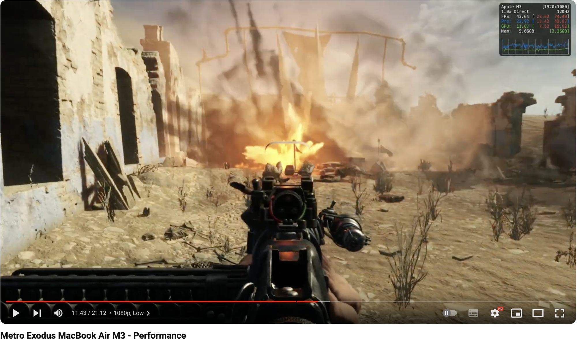 In Metro Exodus though which this discussion was about in the same scene I get 75 fps at 1080p High while Lenovo Yoga also gets 75 fps according to the screenshot. That’s the odd thing because M1 Max 24c is much faster than 258V Arc 140V 8c. Intel’s numbers with 45 fps in Metro Exodus at 1080p Medium are also for Ultra 9 288V, not 258V in Lenovo Yoga with slower CPU/GPU. I also noticed that your screenshots are much brighter than mine and other images from Metro Exodus 2019 with default settings. Yours look very much like images from the enhanced Edition as in Digital Foundry’s comparison, but maybe you turned up the gamma to the max for some reason because that’s what it looks like.