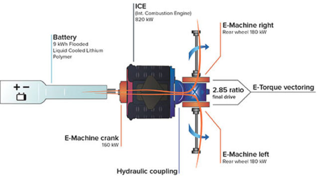 This isn't quite right. One electric motor is mounted on the crankshaft in front of the ICE. The other two are on the rear axle. All three electric motors operating in conjunction deliver variable torque such that no conventional gearbox is required. It's an interesting concept but I'd hate to find out what happens if one of those motors fails at 240 MPH.