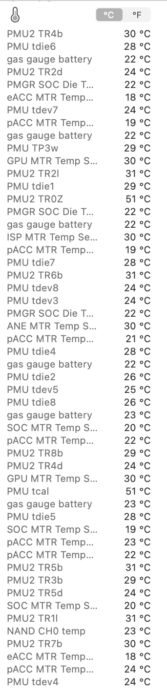 Weird. Looking again at my test code, I'm only seeing 2 sensors for the efficiency cores and 7 sensors for the performance cores. So either my interpretation of what the labels mean is wrong (likely) or something changed with macOS 12.0.1. I'm guessing my code has bugs but what seemed obvious before no longer makes any sense.The pACC MTR Temp is for the performance cores (one for each core). The eACC MTR temp is efficiency cores (one for each core). GPU MTR Temp is the GPU (apparently just one for all GPU cores). ANE MTR Temp is the Apple Neural Engine. ISP MTR Temp is the Image Signal Processor. NAND CH0 temp is the NAND controller for the SSD. Gas gauge battery might be the battery temp. The rest probably aren’t very important to most uses.