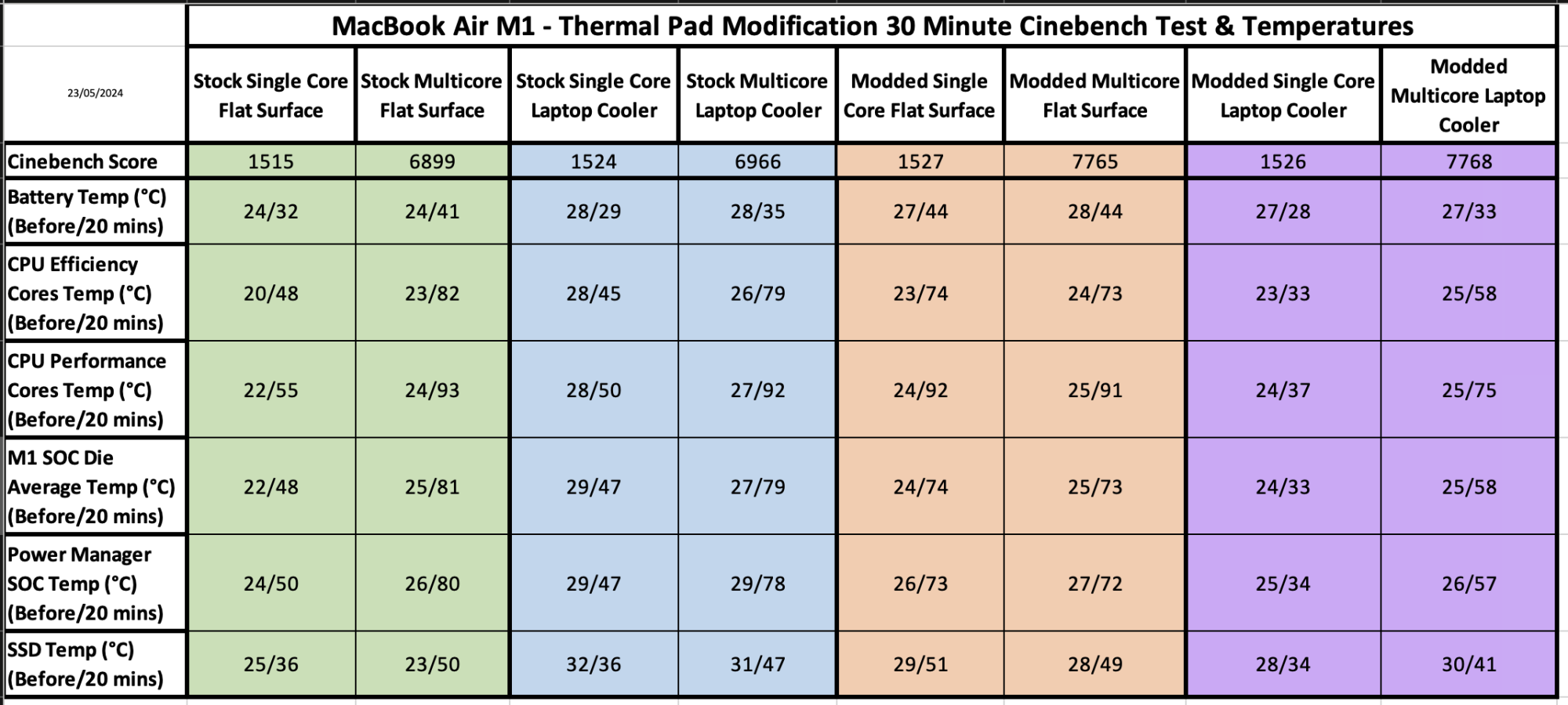 Fantastic post, took delivery of my M1 MacBook Air this week and my thermal pads should be arriving tomorrow.Finally decided to try this mod on my base model M1 Macbook Air (8-core CPU, 7-core GPU, 8GB RAM, 256GB SSD), the results so far have been very impressive.