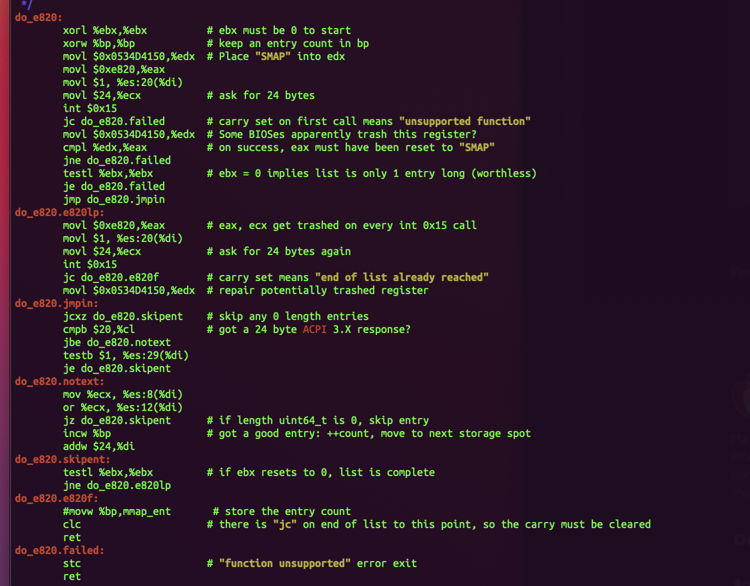 Full disclosure; The above code is from the following GitHub repo, and is not my won. I've written a fair bit of assembly for various reasons but this was the nearest thing I had ready and worked for the joke - plus it's an awesome repo, so if you're interested in bare metal boot up, bootloader and low level x86 development, do check it out: