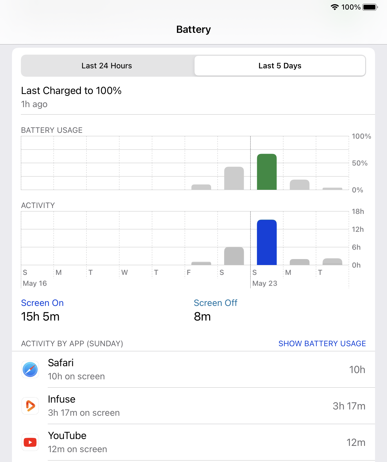 Don’t need to use that screenshot as I know how long it was off charge. It was 5 hours screen time and over 9 hours off the charger. That was also the first full day’s from 100% charge.That’s the screen time display, not battery usage. Go to settings battery and screenshot the 5 day usage figures