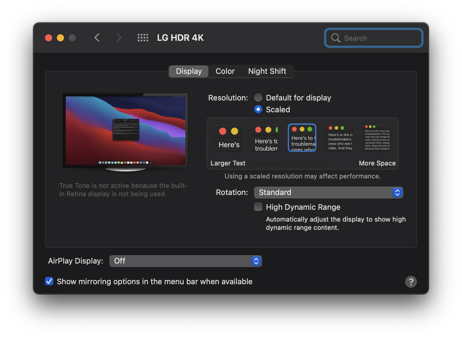It depends. I’m sitting about 3 feet from screen and using it in “looks like” 2560x1080 mode. From that distance, it is perfect for me. But that’s of course subjective, some will find fonts and user interface too big in this particular HiDPI mode, same with 3008 pixels horizontally.