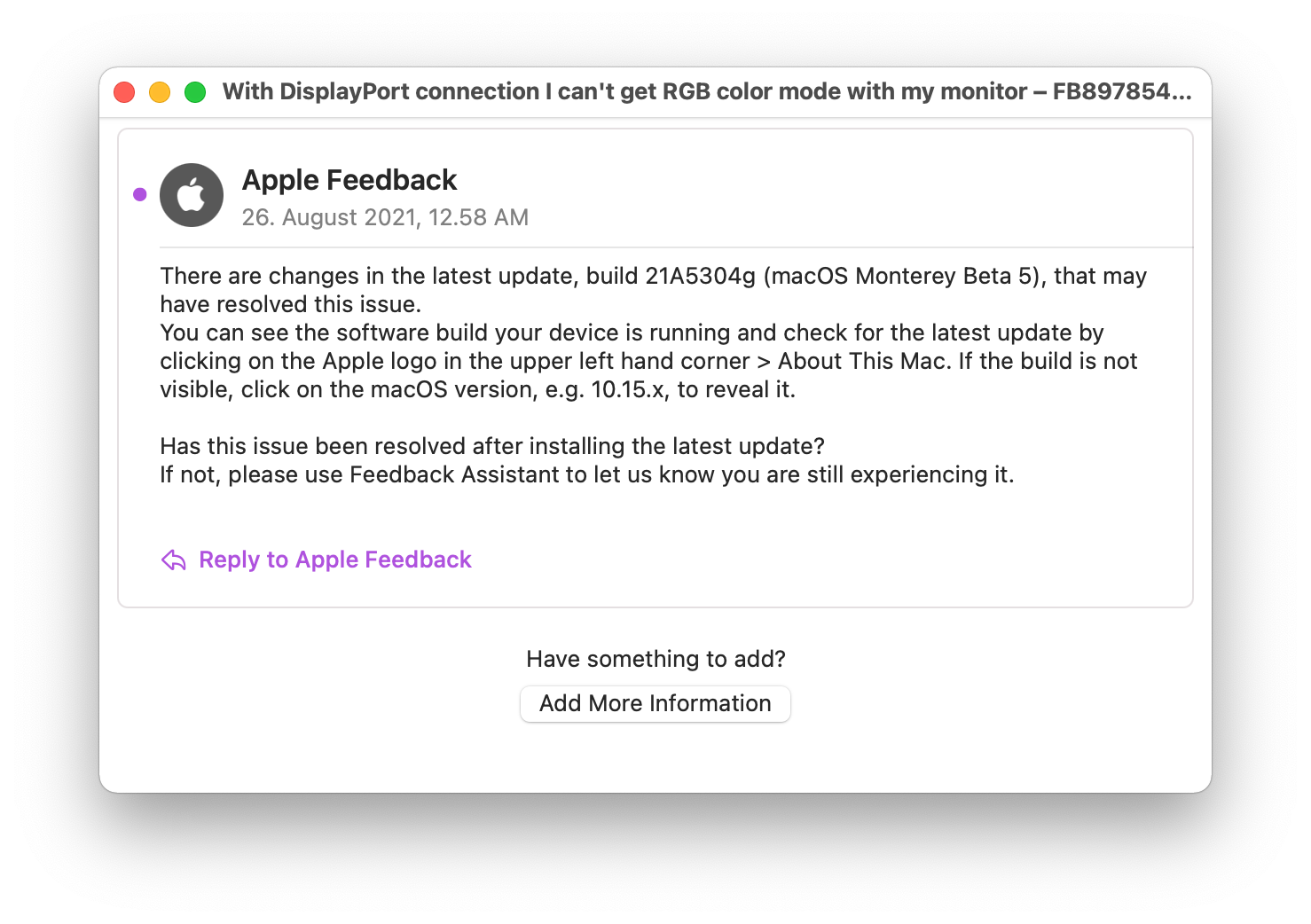 I'm on 12.0 Beta (21A5284e). Display is a 4k Dell P2721Q connected with a USB-C to USB-C cable to a M1 Macbook Air baseline.