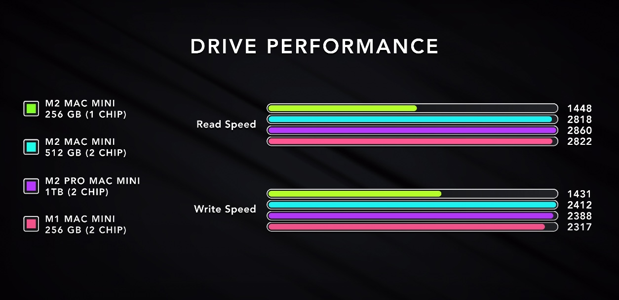 Single chip would mean less than the 3000+ mb/s in the chart thoughHere is the write speed for the M2 Pro Mini 512gb SSD. I think it has a single NAND chip.