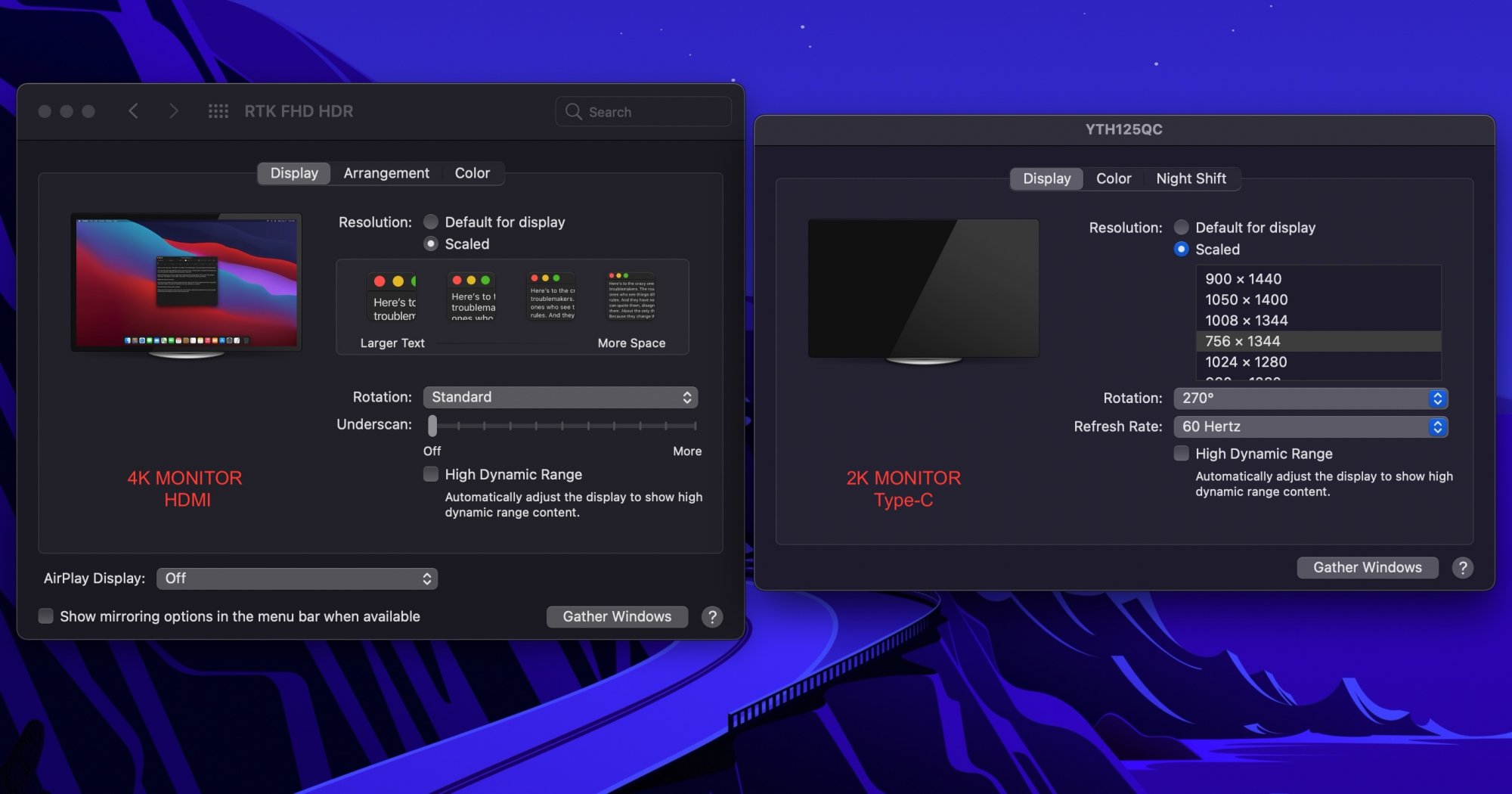 4K monitor supports native HiDPI even on M1 Mac Mini and it's easy to adjust its DPI to please my eyes through Display Settings or RDM menu bar tool. But 2K monitor doesn't have native HiDPI support on M1 Mac mini. I executed DisplayResolutionEnabled command on Terminal and tried to force HiDPI settings for it which previously on my Intel Macs it was easy to adjust any screen's DPI value to my liking through Display Settings (holding shift key while choosing scaled resolutions) or using RDM. But M1 Mac mini won't recognize these forced HiDPI settings whatever I tried. On all my previous Macs I used to apply these manual settings on any external monitor and never had any issues.