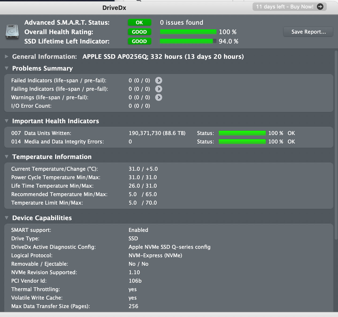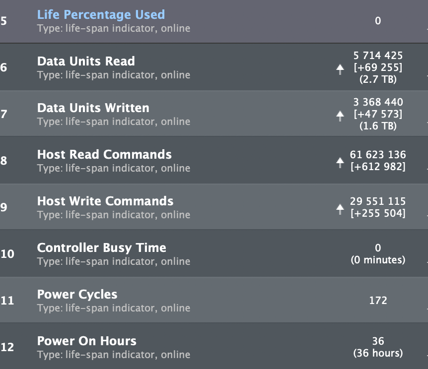 For my 6 year old Mac Mini with a fusion drive (120GB SSD), DriveDx shows Logistical Sectors Written/Read under Device Statistics > General Statistics, might be the same for you. After 6 years of constant use (36,820 hours power on), it has ~90TB written, and ~100TB read. Wear Level Count is down to 39%.I have a 2012 iMac with a fusion drive which is still going strong (used on a daily basis). It doesn't seem to be recording the write rate, but it must be being hit quite hard (only 100GB of SSD, used as a cache for the HDD).