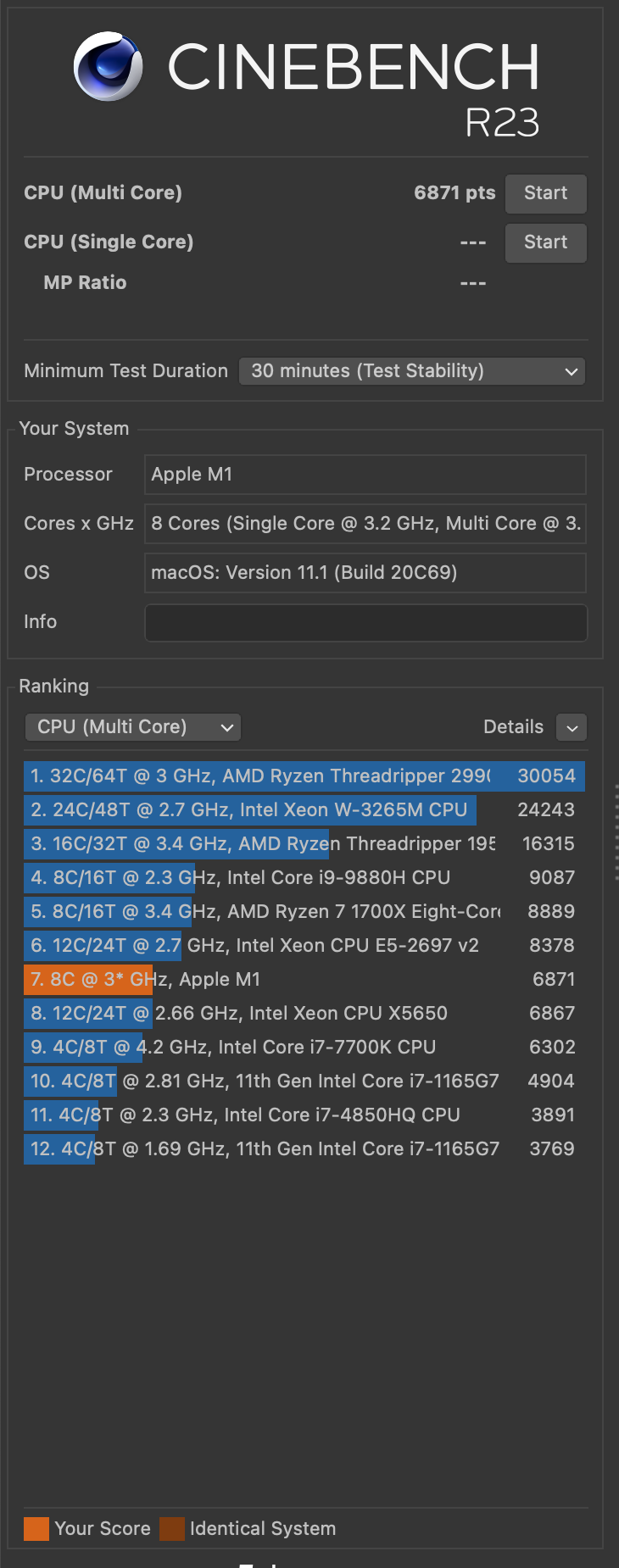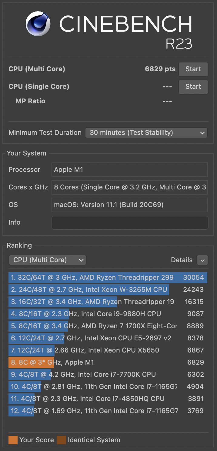 Can anyone here run the 30 minute cinebench r23 test on their m1 macbook AIR and post their score? I want to see how the macbook air does in a 30 minute run which is longer than the default 10 minute and I don't trust the verges 30 minute score until I see someone else's (in fact, I think the verge just came up with those numbers to try to just sell the macbook pro).