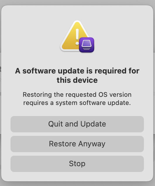 Prior to this, I tried reviving the machine several times to no avail. Clicking "Options" (as in step 5 above) only caused the machine to reboot, show the Apple logo, and black out. I tried reviving using ipsw files for 13.4, 13.5, 13.6, and 14.0 via Apple Configurator, but nothing worked until I upgraded the M2 MacBook Air to Sonoma.