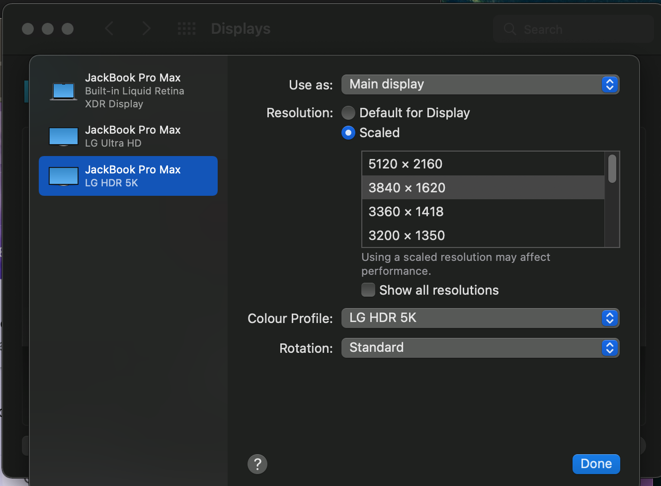 All this through DisplayPort 1.2 on the screen because with 1.4 the macos get the wrong resolutions (non Ultra Wide ones).