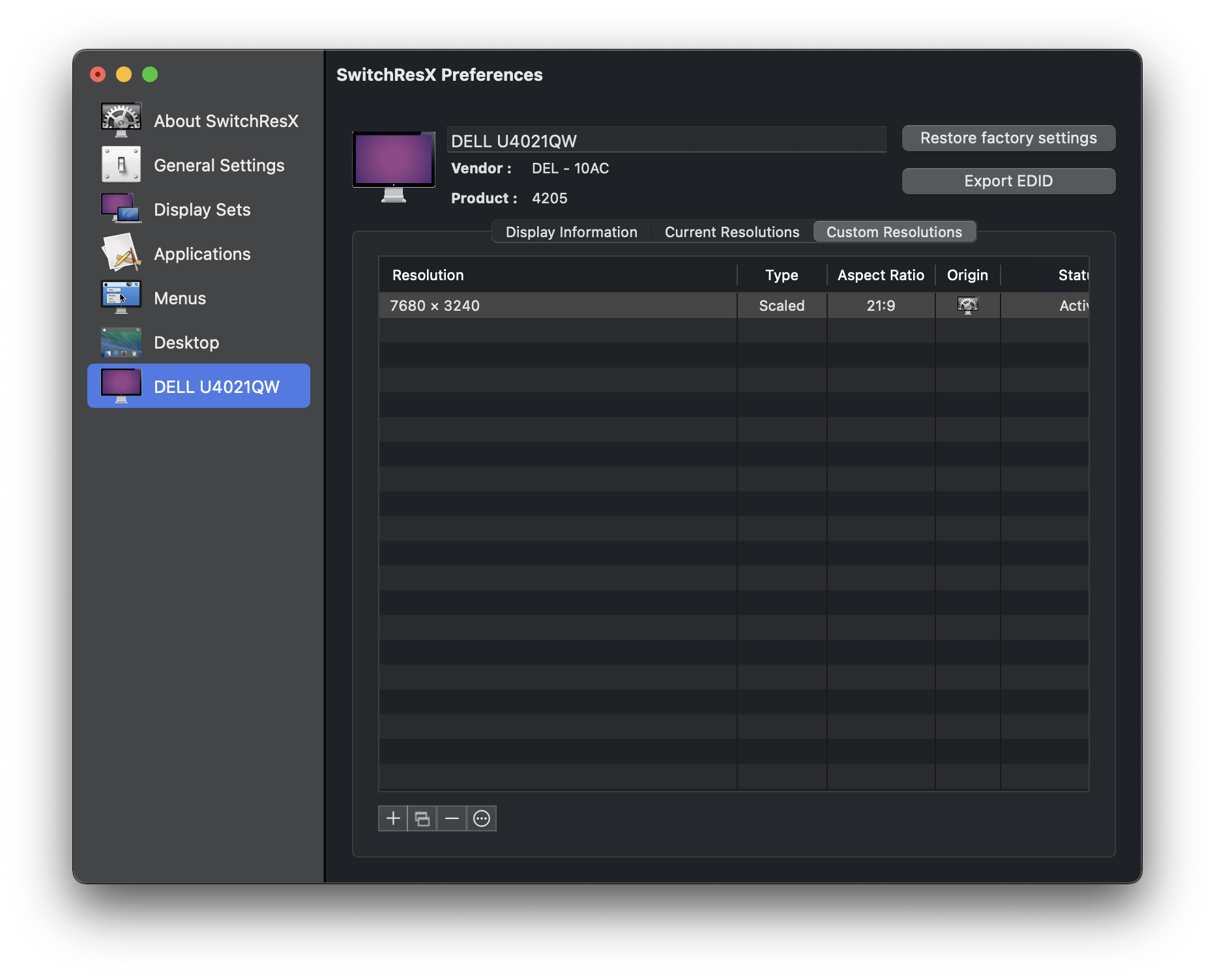 5) after reboot, open SwitchResX and check custom resolution tab for your screen, this shall look like: