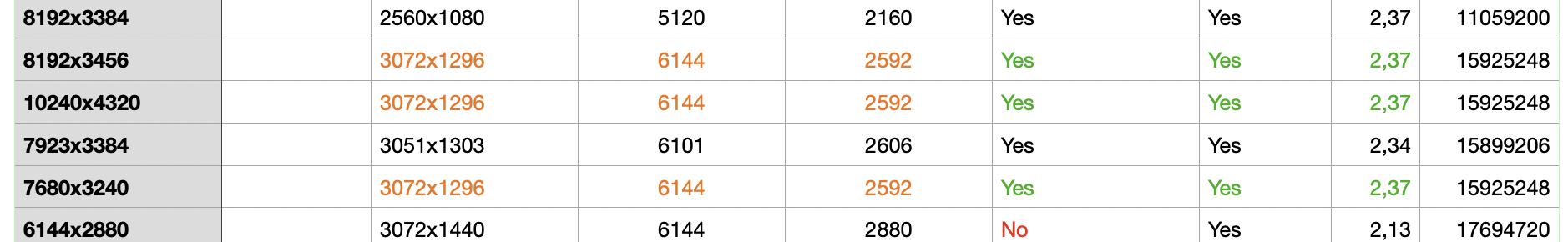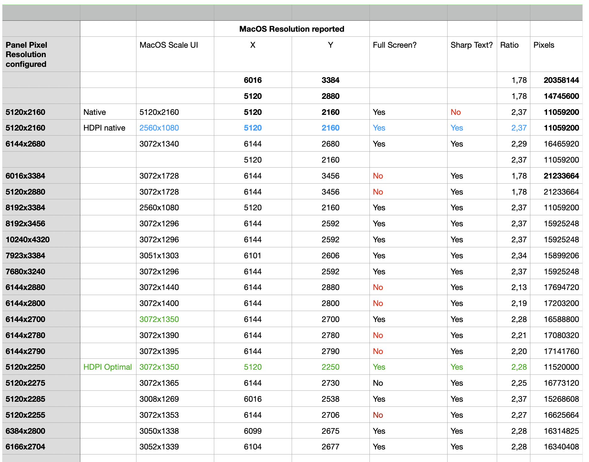 So when sticking to resolution ration between those two , you can try tuning the horizontal and vertical pixel counts , so my strategy was to stick on standard horizontal value ( 5120 or 6144 ) then calculate the vertical , based on the ratio value between 2,27 to 2,37 ... to validate this choice, I tried some unusual resolution, trying to increase ether horizontal or vertical, but it turns out that macOS somehow is converging always to the same values ...