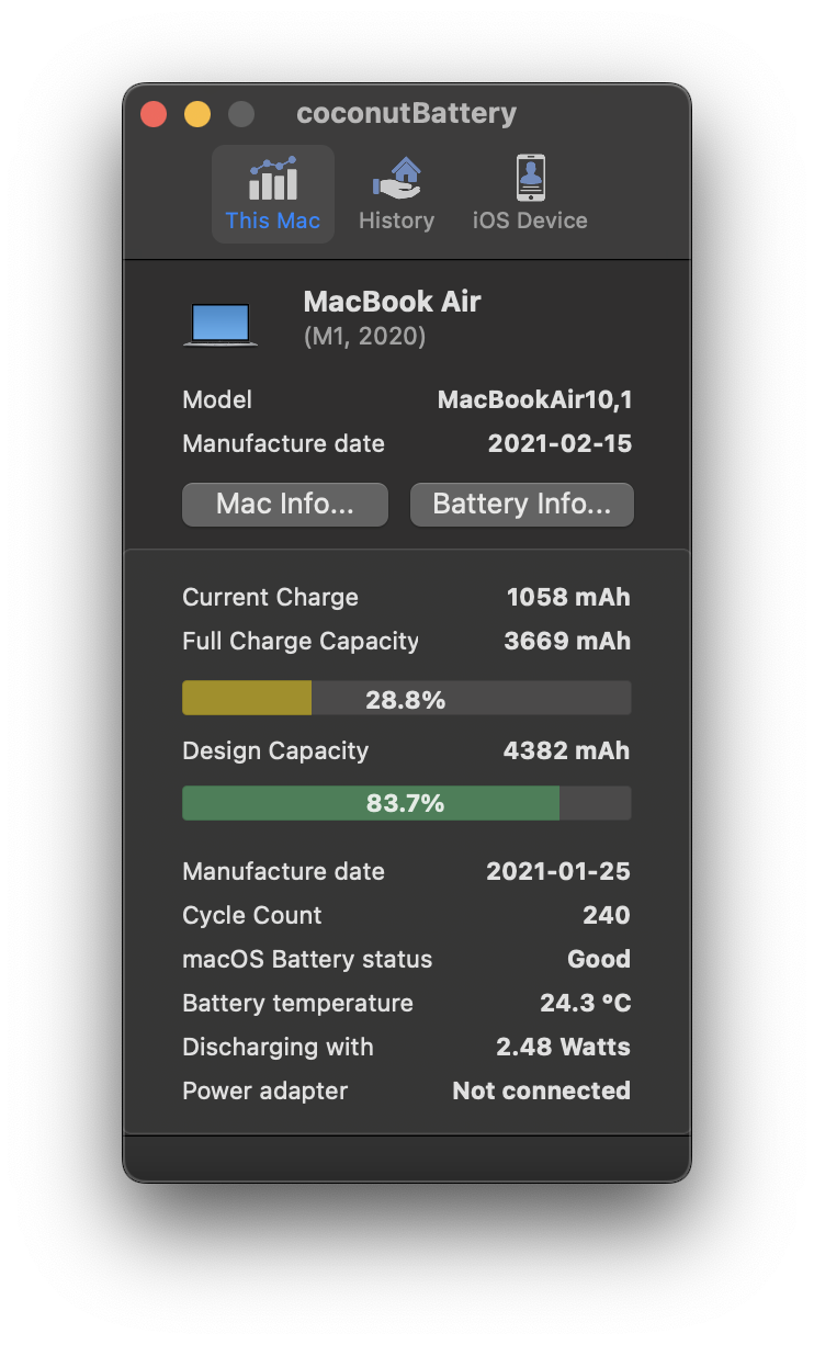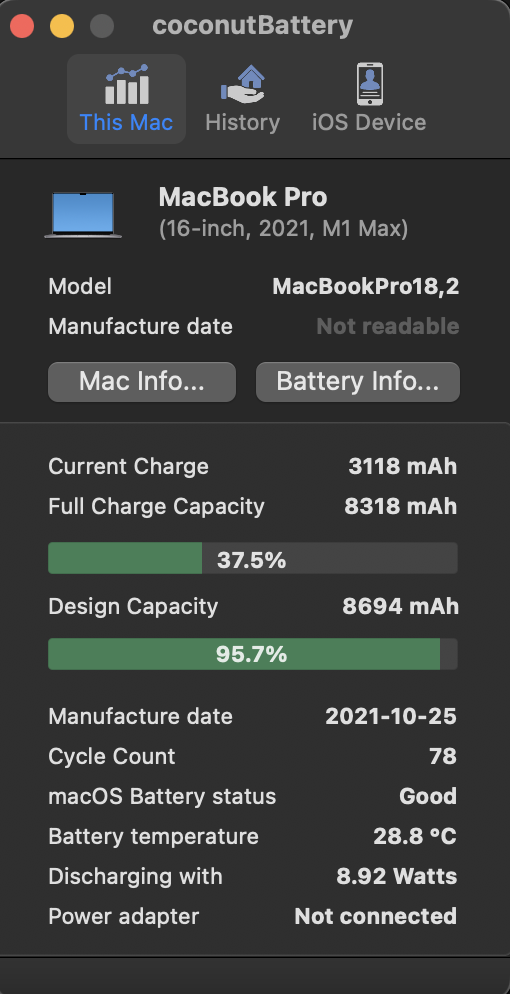 A good way to retain battery health for a long time is to not use it very much. And that means to keep the MacBook plugged in as much as possible, during work and over night. The fewer load cycles the better. I know the recommendation is to not fully load a battery to 100%, but that runs counter to my experience.Just checking to see everyones battery health of those who got theirs on launch like I did. Is it degrading this fast for all of you too? I don't leave my computer charging over night and keep it around 80% and start charging it again around 20%.