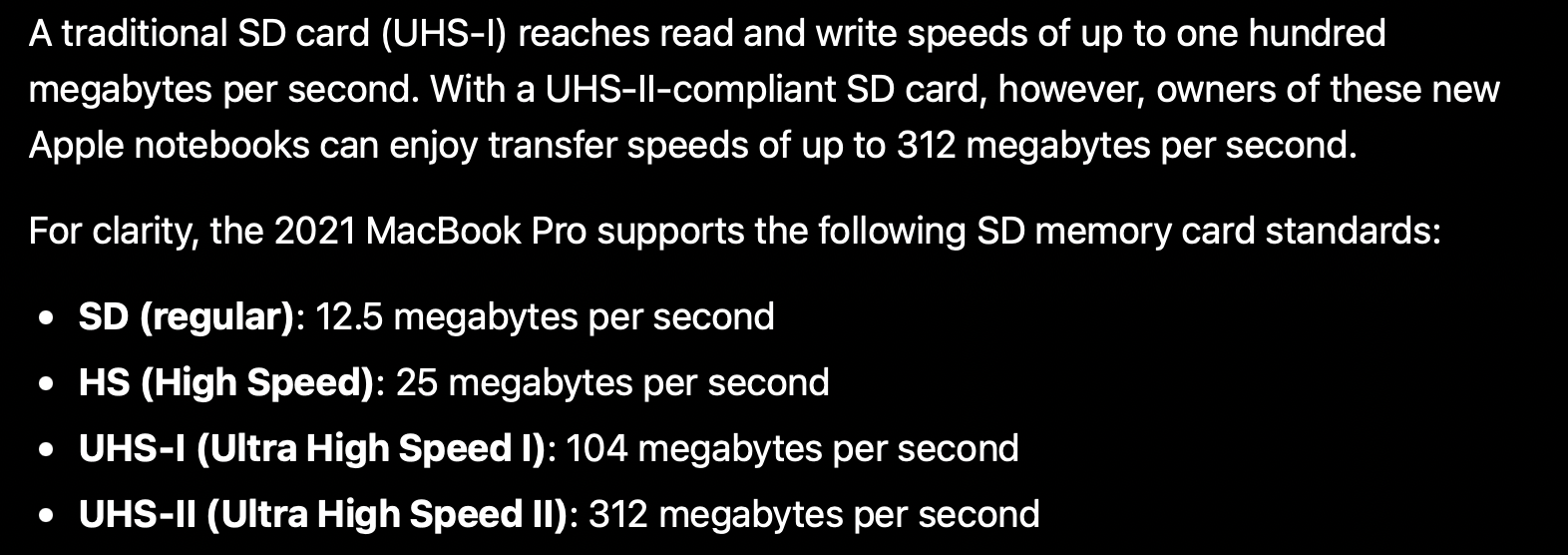 It reads at UHS 2 speeds which is up to 312mb/s. Is that too slow for you? lolI bought the computer mostly for photography use. The MBP M1 Pro SD card reader is roughly 1/5th the speed of the $39 USB-C dongle that Apple sells and is so slow that several SD cards can't be read at all.