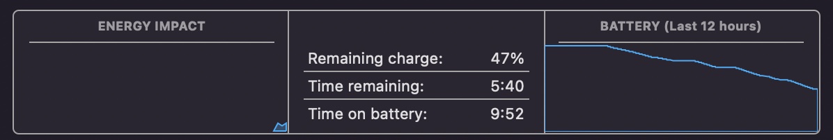 I then unplugged to see if I could get through a work day on a single charge. No particularly heavy tasks, Teams (3 hours) / Word / Image editing / Photos / Excel / Safari / Google Earth Pro (Rosetta 2) / Outlook / OneDrive (Rosetta 2) running / Keynote / etc. A typically day of collaboration, report writing (including creating Figures - maps etc.), presentation design, and data analysis (Excel).
