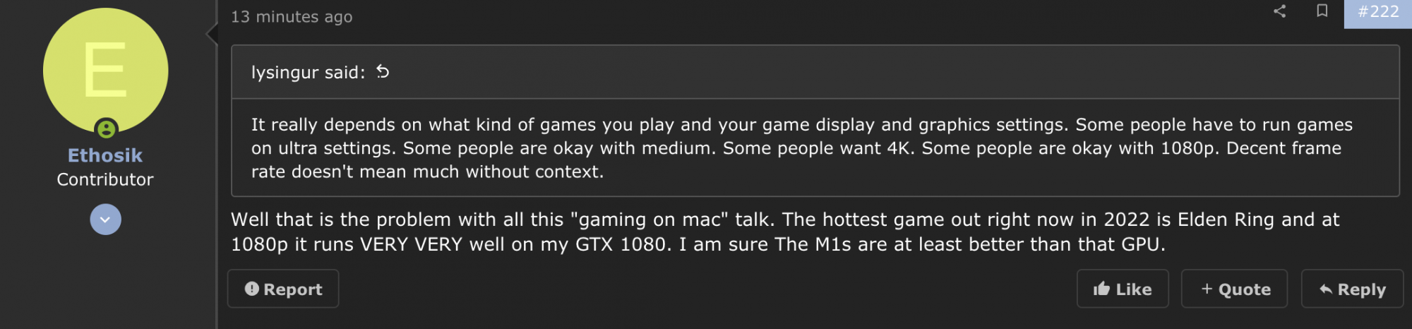 Sorry I got mixed up by the avatar for some reason! No it is you that is confused. Please read my post and understand the context. I don't want to fully spell it out. You are saying people are just fine with medium settings, and I responded that it is why the gaming on mac talk is ridiculous because people keep saying Apple NEEDS.....NEEDS NVIDIA in order for gaming to work. They NEED the 3080s and 3090s in order for gaming to work. Elden Ring can run very well on macOS if its ported because it runs just fine on a 1080 GPU.You did respond to me. It's you who got confused, buddy.View attachment 1975533