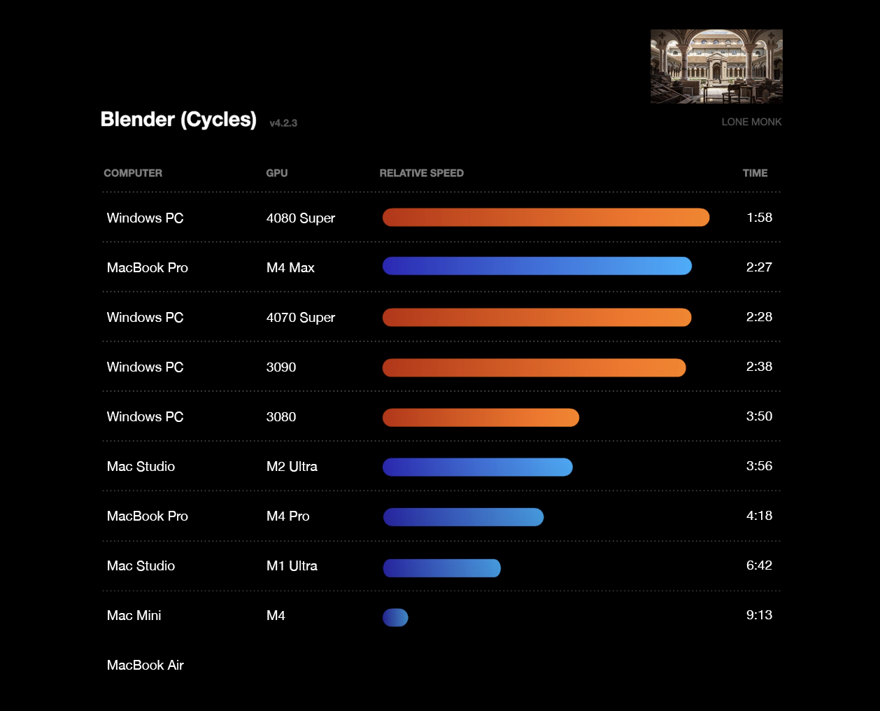 In conclusion, we can see that in at least this one renderer's case, the M4 Max has improved efficiency over the M2 Max by about 40% in addition to having its performance increase by 2.55x over the M1 Max (and 2x over the M2 Pro/Max). Sadly I don't have efficiency figures for the M1 Max but the improvement is probably better than 40%. Of course not every renderer will show as good results, Redshift for CB R24 seems particularly well optimized for AS. Lastly, depending on the design of the core, overclocking does not necessarily yield better performance and certainly not for free.