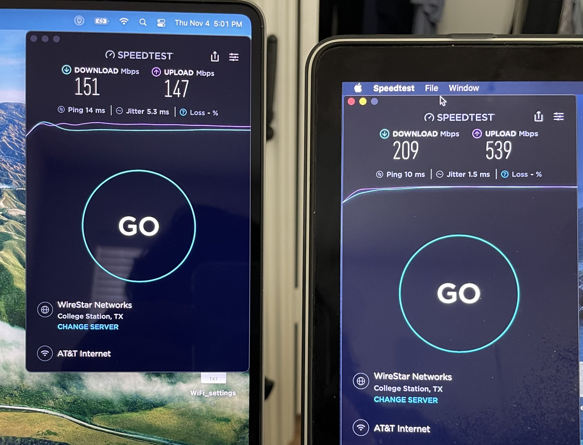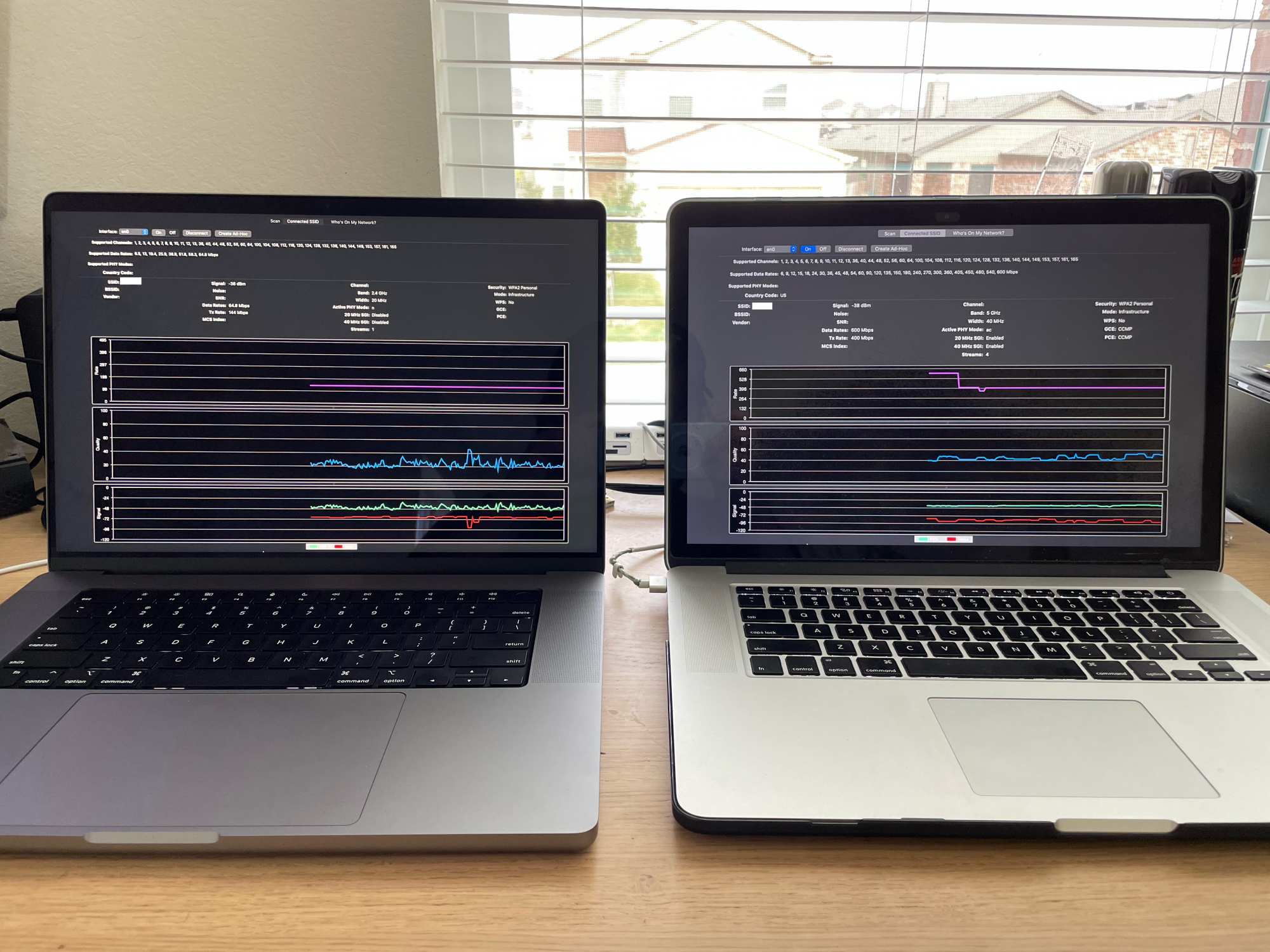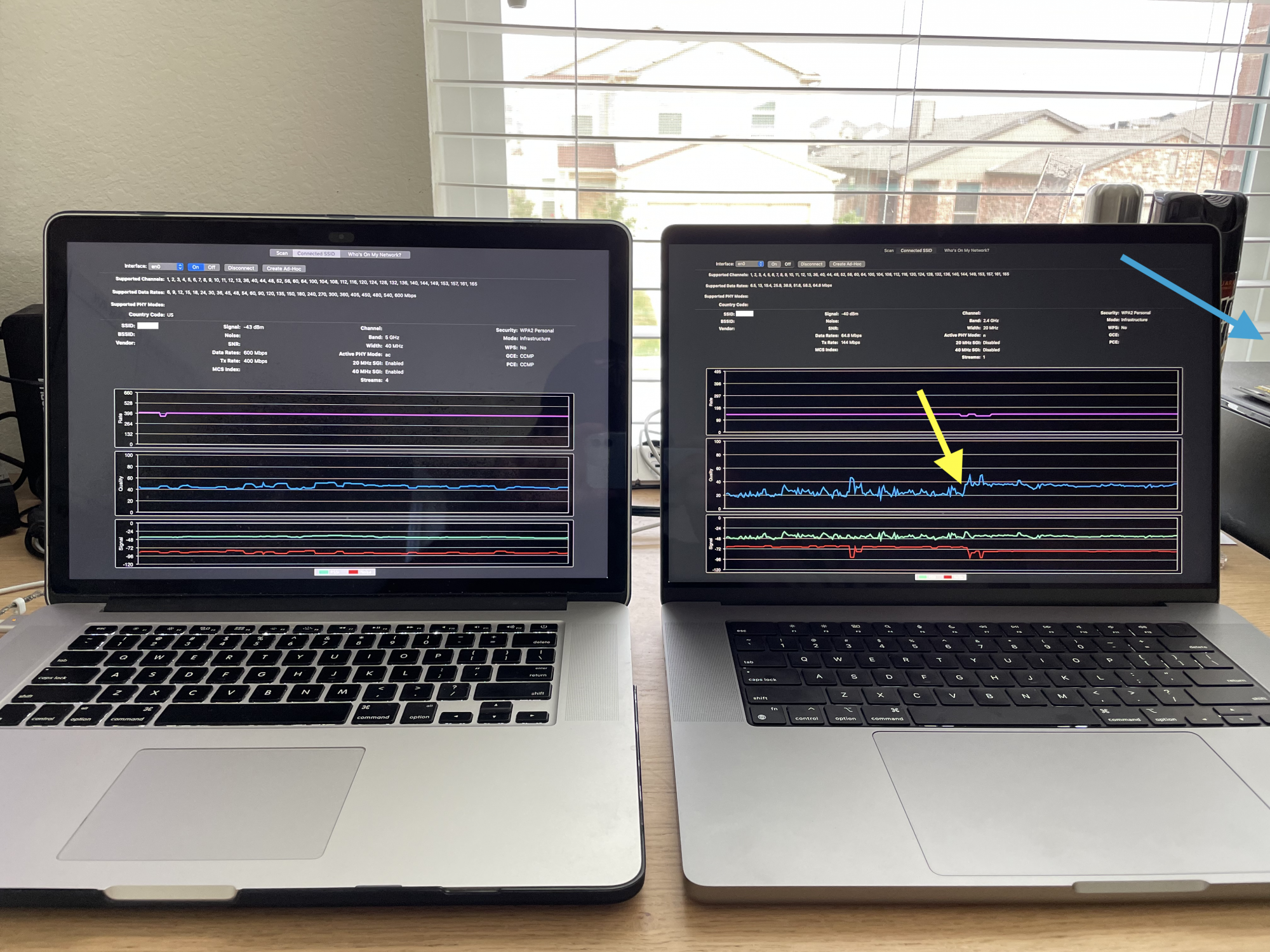 The yellow arrow indicates where I moved the 2015 MBP to be further away from wifi and the 2021 MBP closer.
