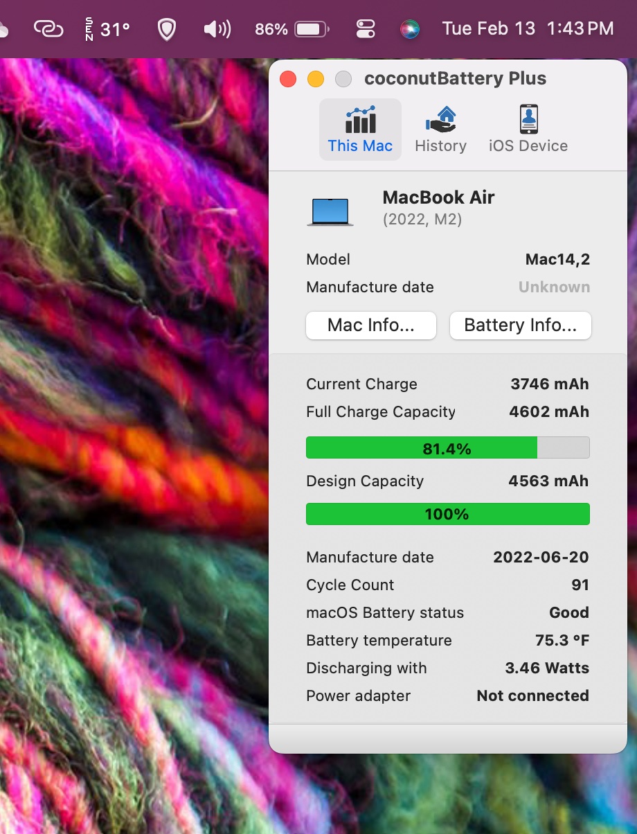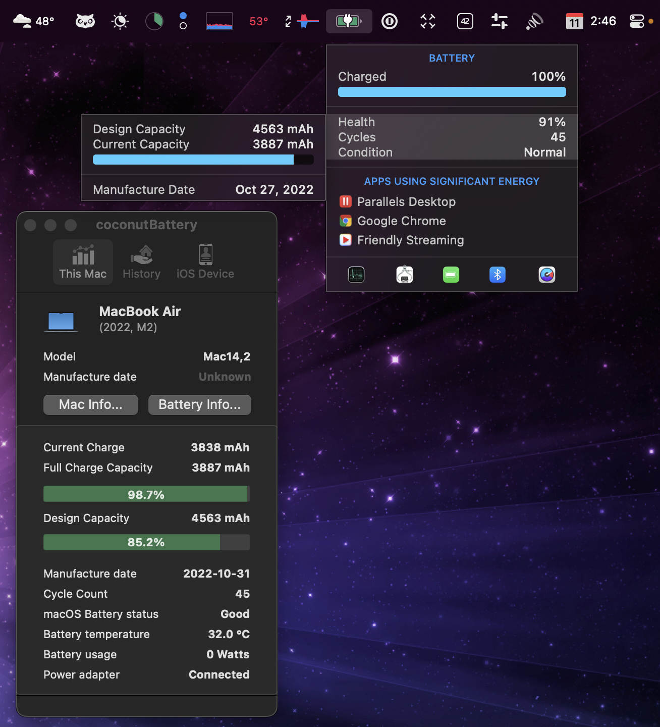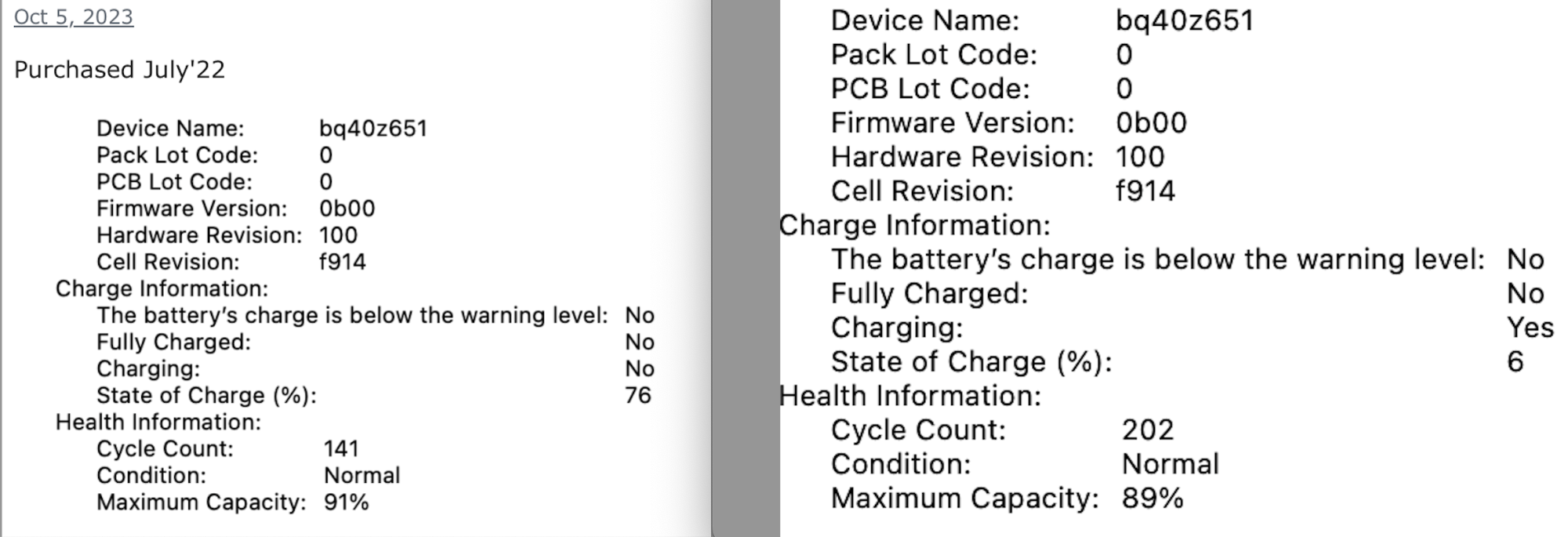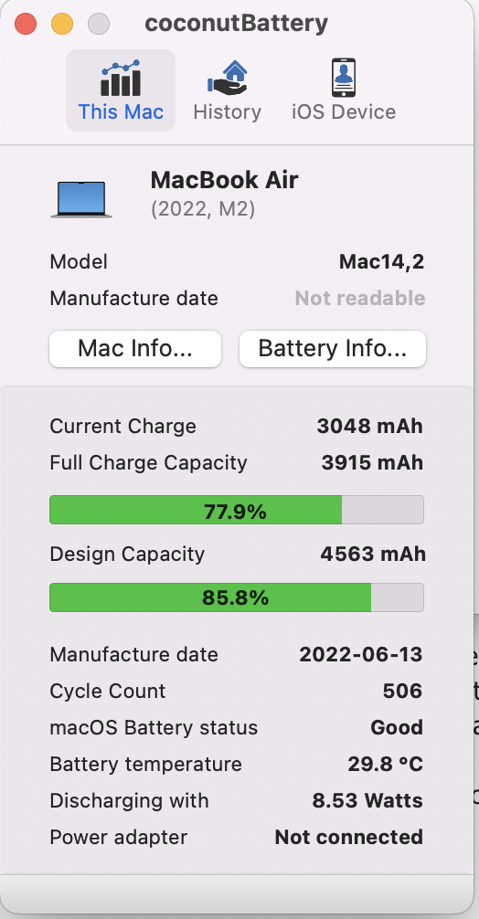 So, I have three M2 MacBook Airs (two 13" and one 15") - they all have about the same amount of use and charge cycles, but the battery in one of the two 13" MacBook Airs seems to be suffering from premature battery degradation (with few battery cycles) as you can see in the battery apps below: