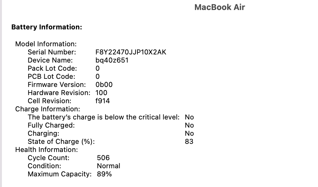 My other MacBook Airs have either the same amount of charge cycles or more, but their batteries are still at 100% 'health'. Is this just a bad battery, or is macOS just not reading the health correctly? Losing 9% of the battery's capacity after only about 30 charge cycles (it's been stuck at 91% for months) doesn't sound right to me, especially when my other MacBook Air's are still at 100%.