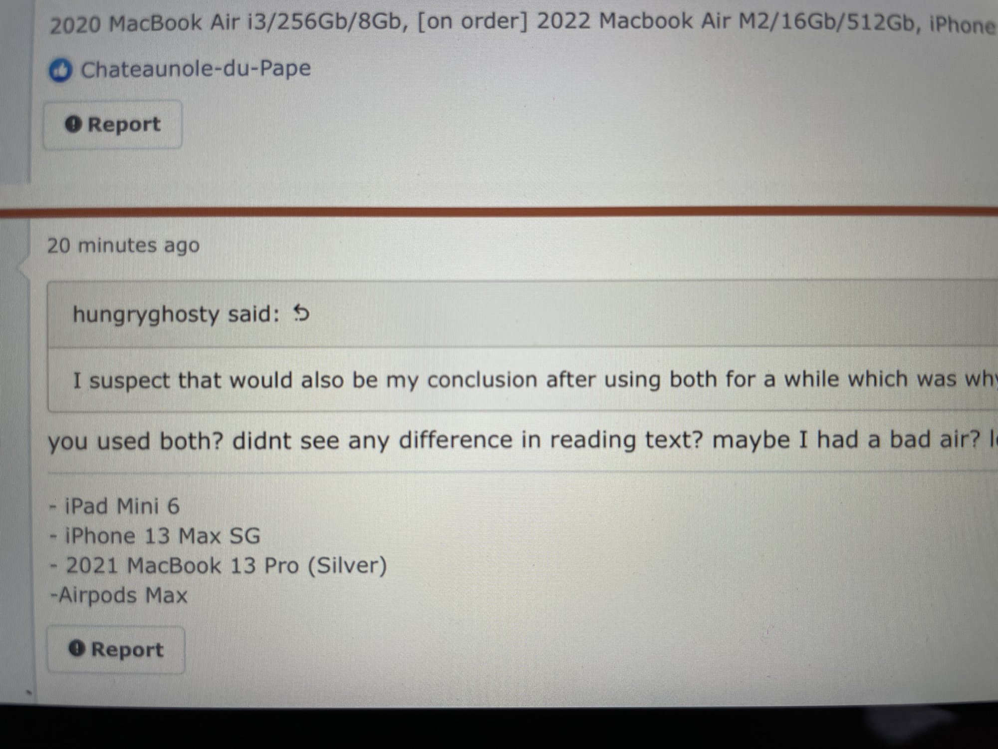 And while the Pro screen is superb, the Air screen is also fantastic -- yes there are differences that can be seen when looking at them side by side, like the Pro contrast ratio is noticeably better -- but it's a laptop, not a 70" big screen TV. I'm not going to pull up a bag of popcorn and gather the family around a 14" screen for movie night, no matter how awesome the CR is relative to the IPS on the Air. Can I see a difference between 60hz and 120hz? Yes. Do I spend the majority of my day scrolling around at top speed cursing the slight blur I see @ 60Hz? No. And I don't game, so that's a non-issue. Also, I noticed that I was getting eye aches when looking at the Pro screen for any significant duration -- I don't get that with the Air panel. ???