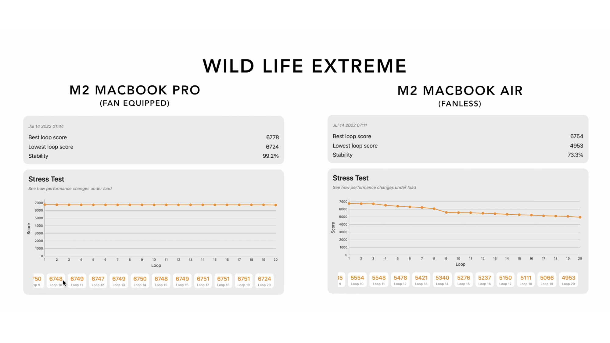 This is important. From what we've seen of the Max Tech reviews, the M2 13" Pro sustained was actually worse in a lot of cases compared to the M1 13" Pro, right? I am afraid for the M2 Air due to that discovery. Eagerly awaiting Max Tech's reviews.longer sustained performance. the m2 without a fan will have to clock down eventually