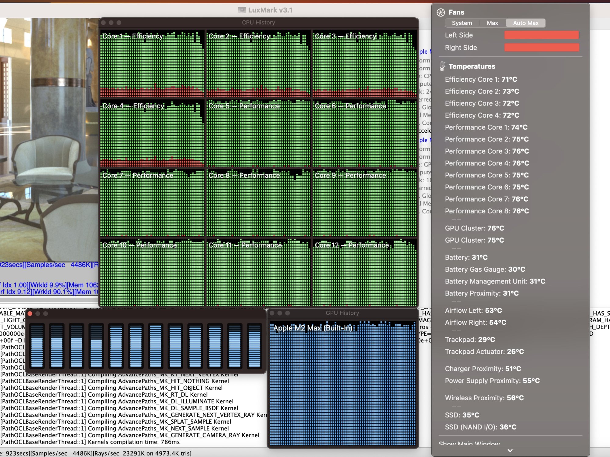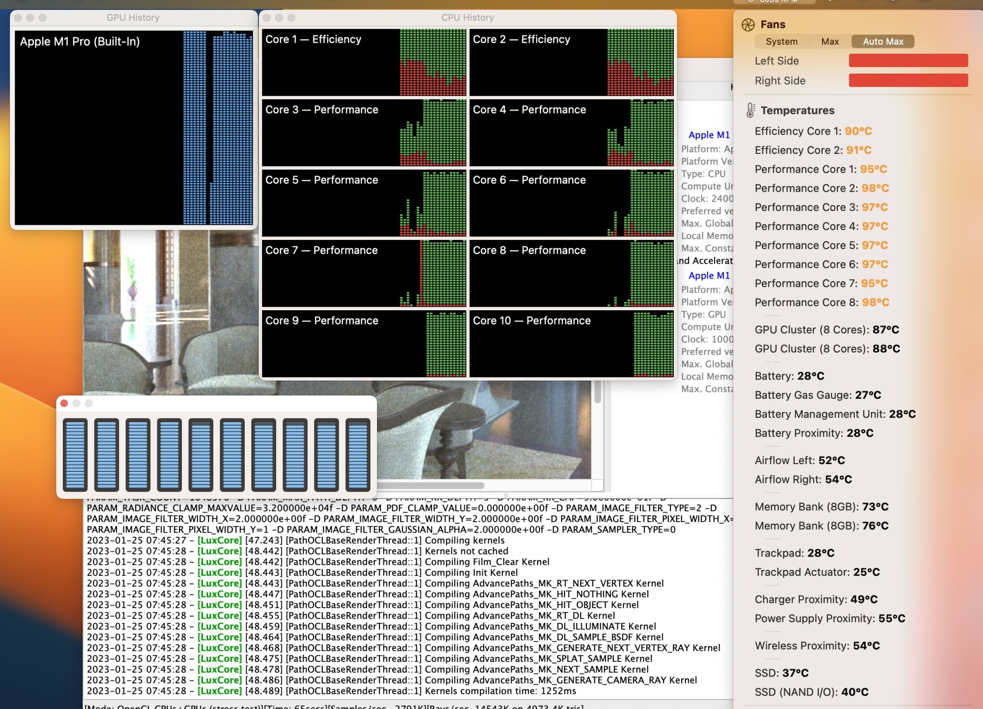 That looks promising, 30 core 16" hopefully will keep chugging without fans needing to be raised too high then.I dunno there's plenty of thermal headroom. Here's screen shots maxing out the CPUs/GPUs with Luxmark compared to my 14" M1 Pro 16 core. Fans are max on both.