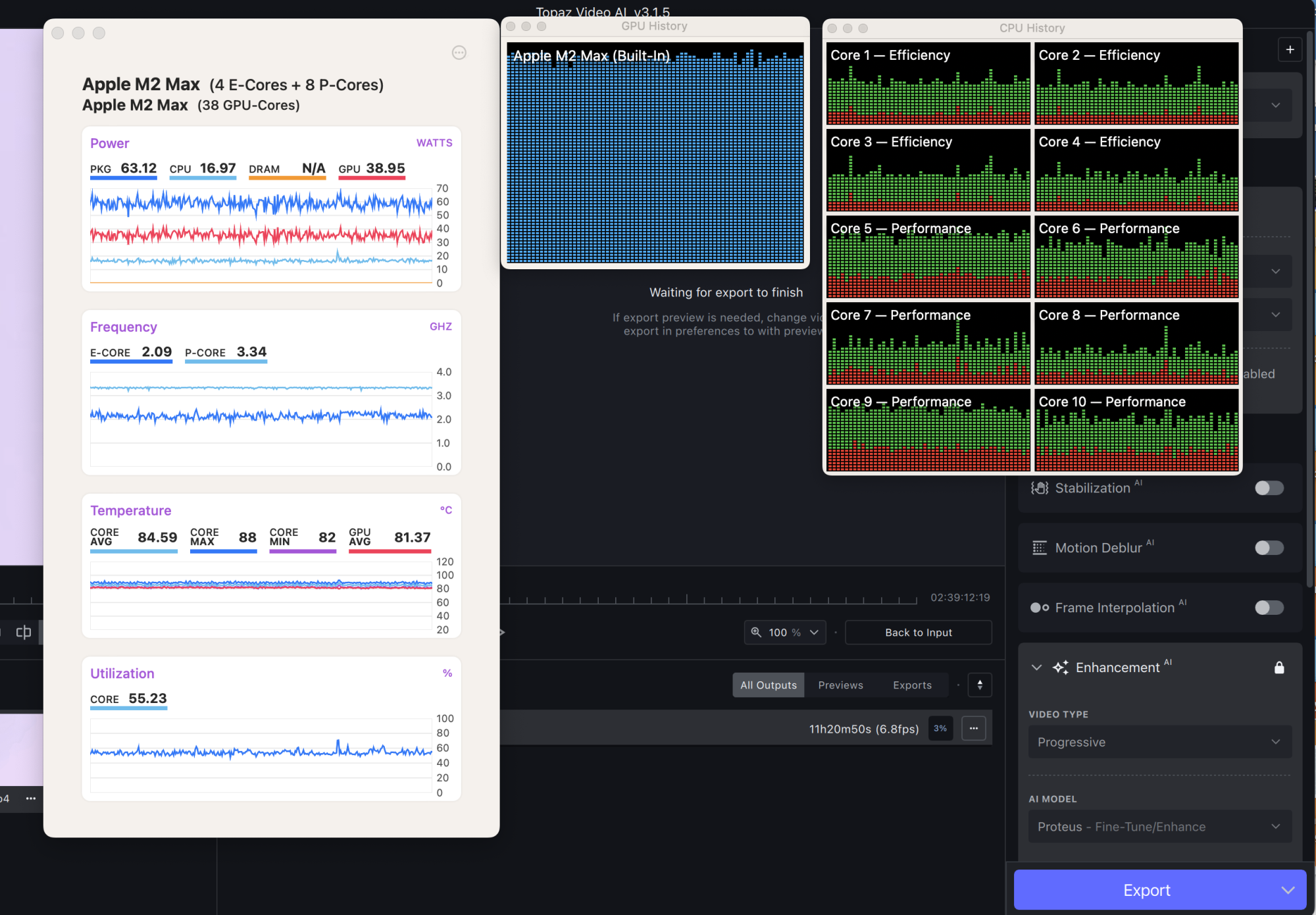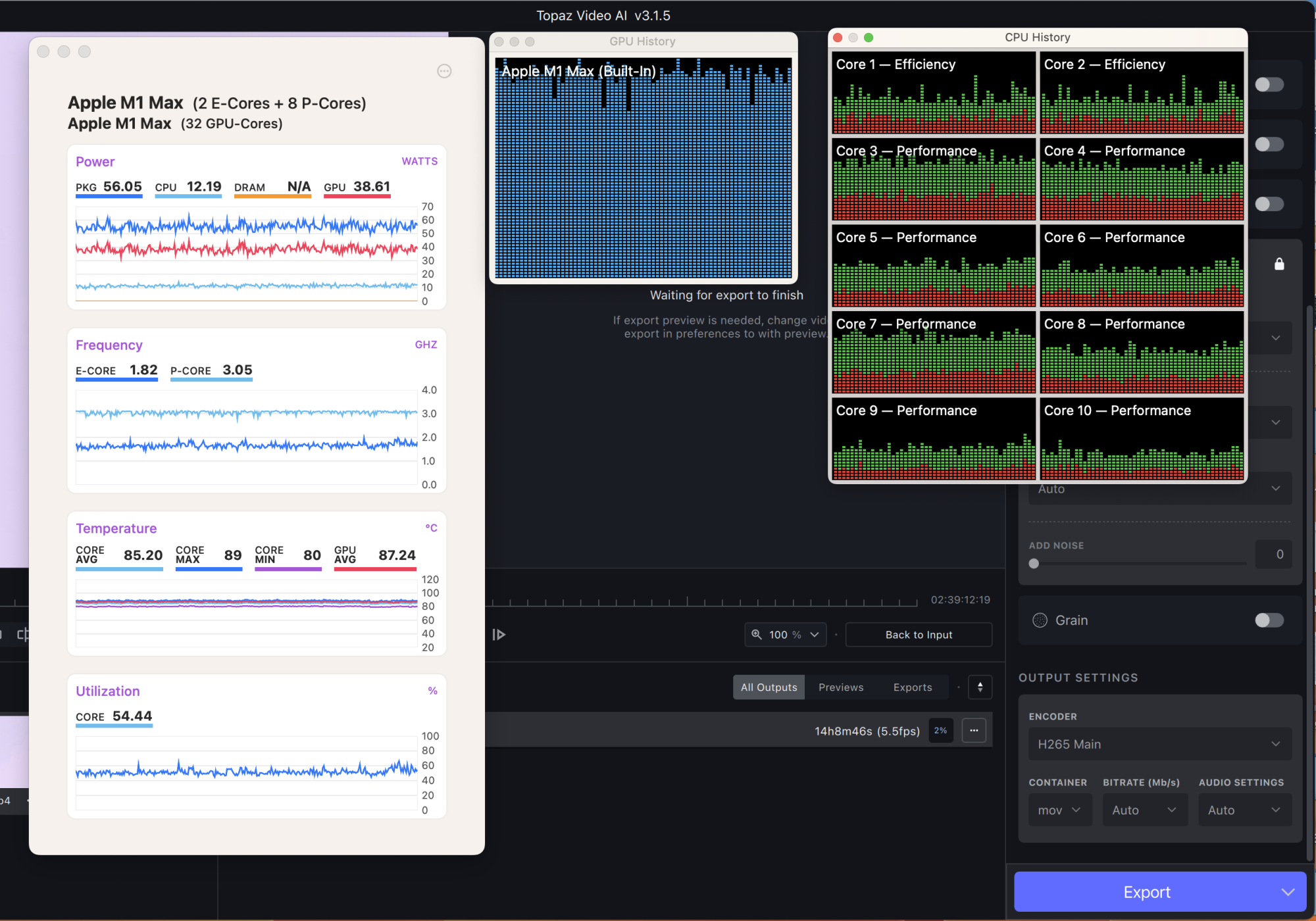 I've done some more test runs with Video AI with the 14" M1 Pro, M1 Max 24, M1 Max 32 and M2 Max 30. I also ran the 16" M1 Max 32 and M2 Max 38 along with it. I just started running MX Power Gadget so I could watch what was going on more closely because I've seen so many unexpected results. One thing that was immediately clear and that I've not seen any reviewer mention is that the 14" model has a sustained TDP of ~30watts where the 16" has a ~60watts TDP. In other words the reviewers keep saying the chips are thermal throttling but that's not what is going on in most cases. The chips are capped in the amount of power they can draw which is what is controlling how fast they can run. I suspect this is because the 14" model has a smaller battery because there appears to be thermal headroom in there so they could draw more power. I've seen it occasionally burst a little higher too. If they were thermal throttling and not power limited the chips would still run full speed when at lower temps like I showed in some of my original screen shots.