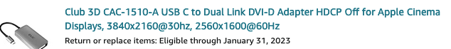 I have the now discontinued Apple Mini DisplayPort to Dual Link DVI Adapter and from there I then have tried the Apple Thunderbolt 2 to 3 adapter and two different 3rd party Thunderbolt 2 to Thunderbolt 3 adapters I bought on Amazon and nothing has worked.