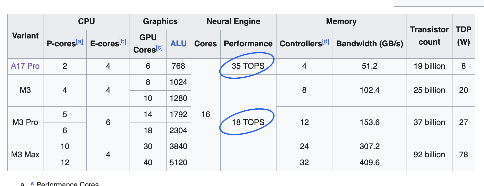 Why is the M3' Neural engine so much worse than the A17 pro? Source: Wikipedia