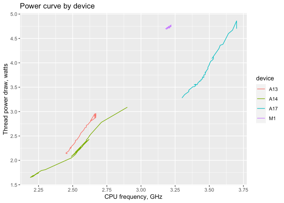 I picked up my iPhone pro today and ran a simple power and frequency test of my own making. The detailed data and description of methodology is here: