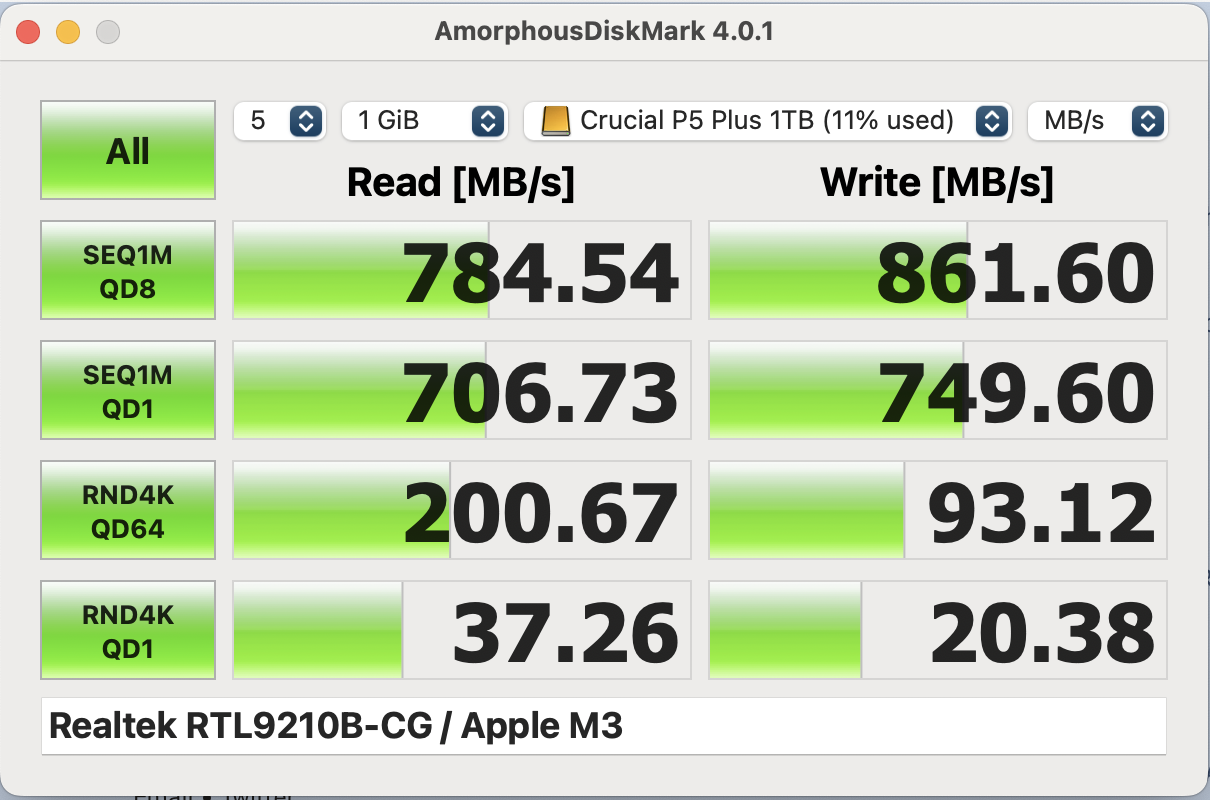 I use the one that I use, I suggest you do the same, its free and you will get similar resultsKindly let's do the tests with the same software, we use this one which is free https://apps.apple.com/us/app/amorphousdiskmark/id1168254295?mt=12