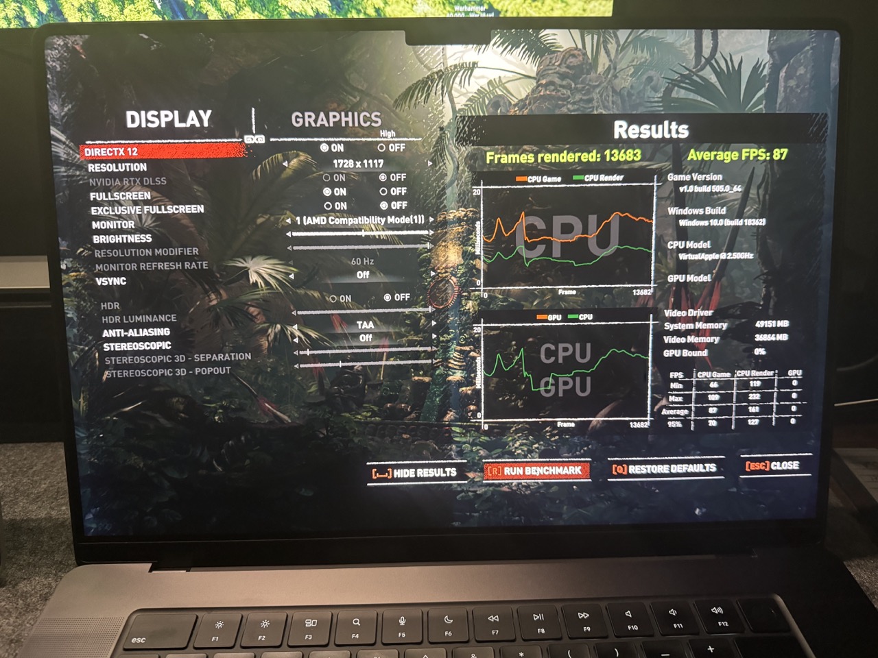 M3 Max 14/30 - 39.54 Avg FPS | 86.96 High FPS | 12.39 Low FPS