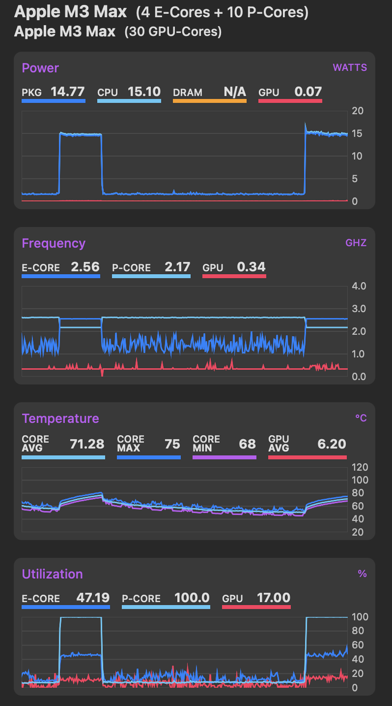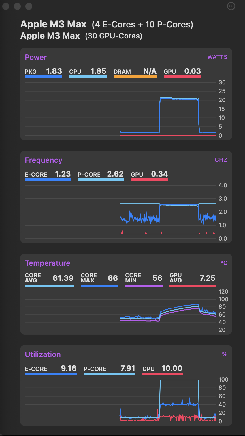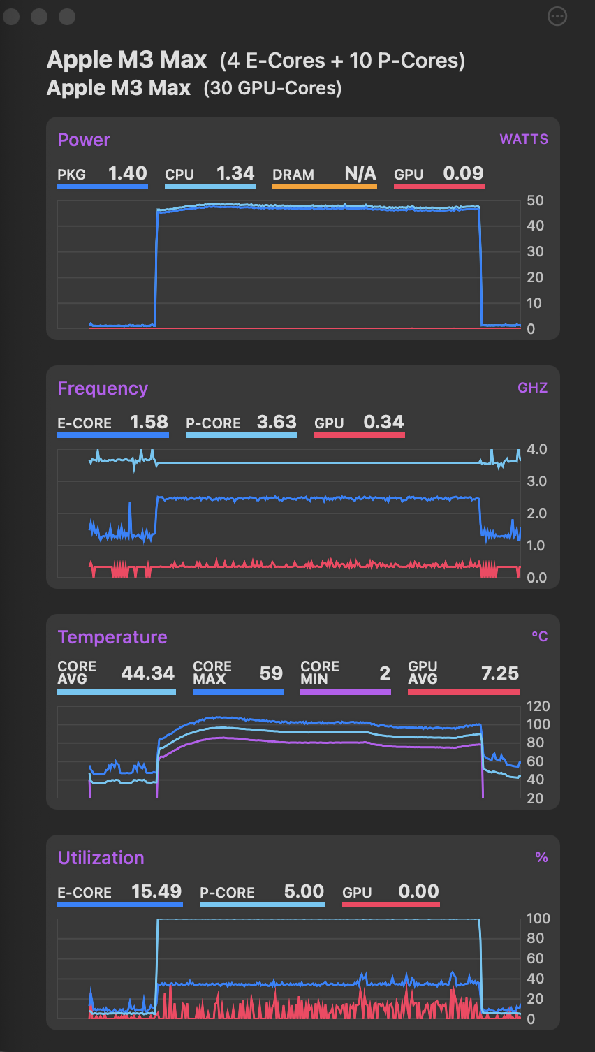 When running the script written by Leman, Powermetrics showed that my CPU+GPU+ANE are consuming alltogether 48W, which was already higher than the M4 Pro TDP I found online, but "PHPS" read an even higher 54W power consumption, and the system total consumption was around 58W.