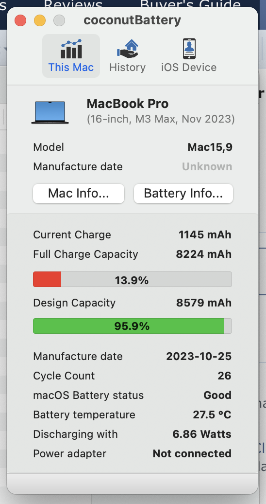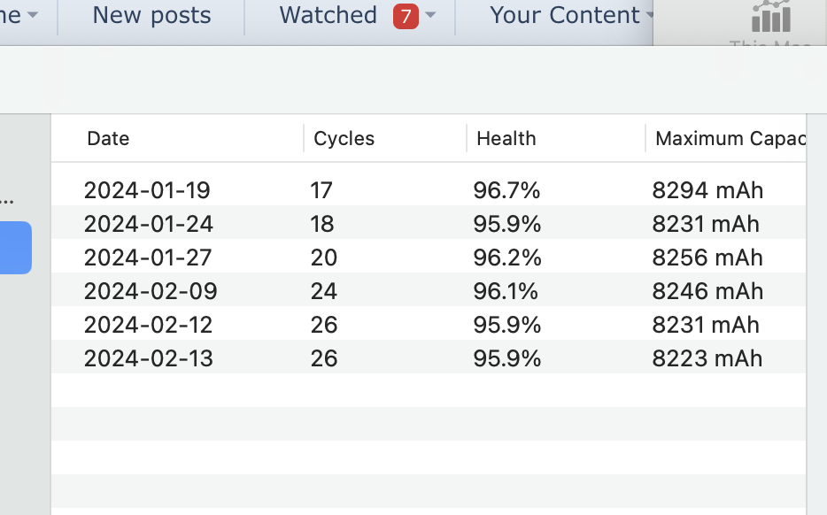 Got a M3 Max 16/40 64gb/1tb which i bought brand new in November and on installing coconut noticed the full charge capacity has dropped to 96% since i had it.